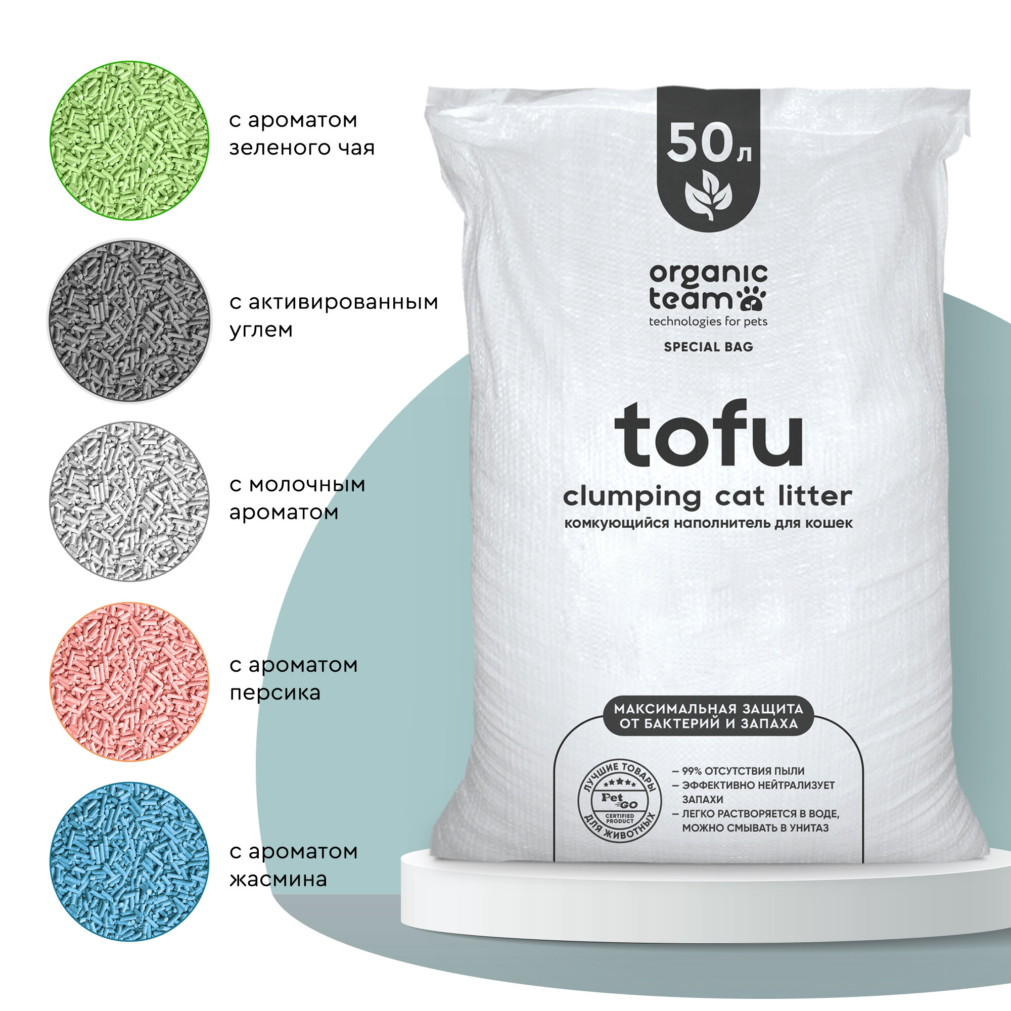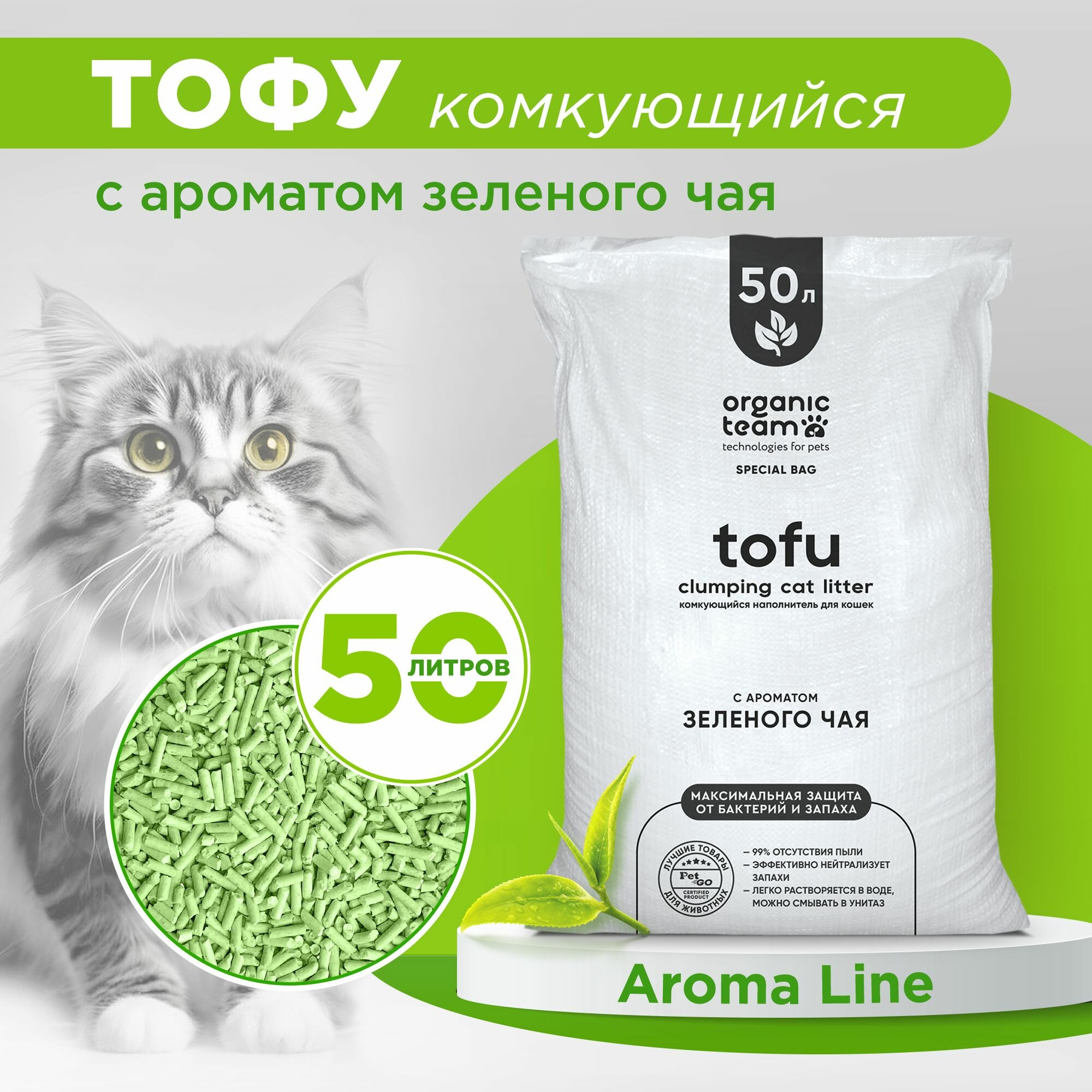 Комкующийся наполнитель для кошек тофу, Organic team с ароматом зеленого чая, 20 кг, 50 л интересное: