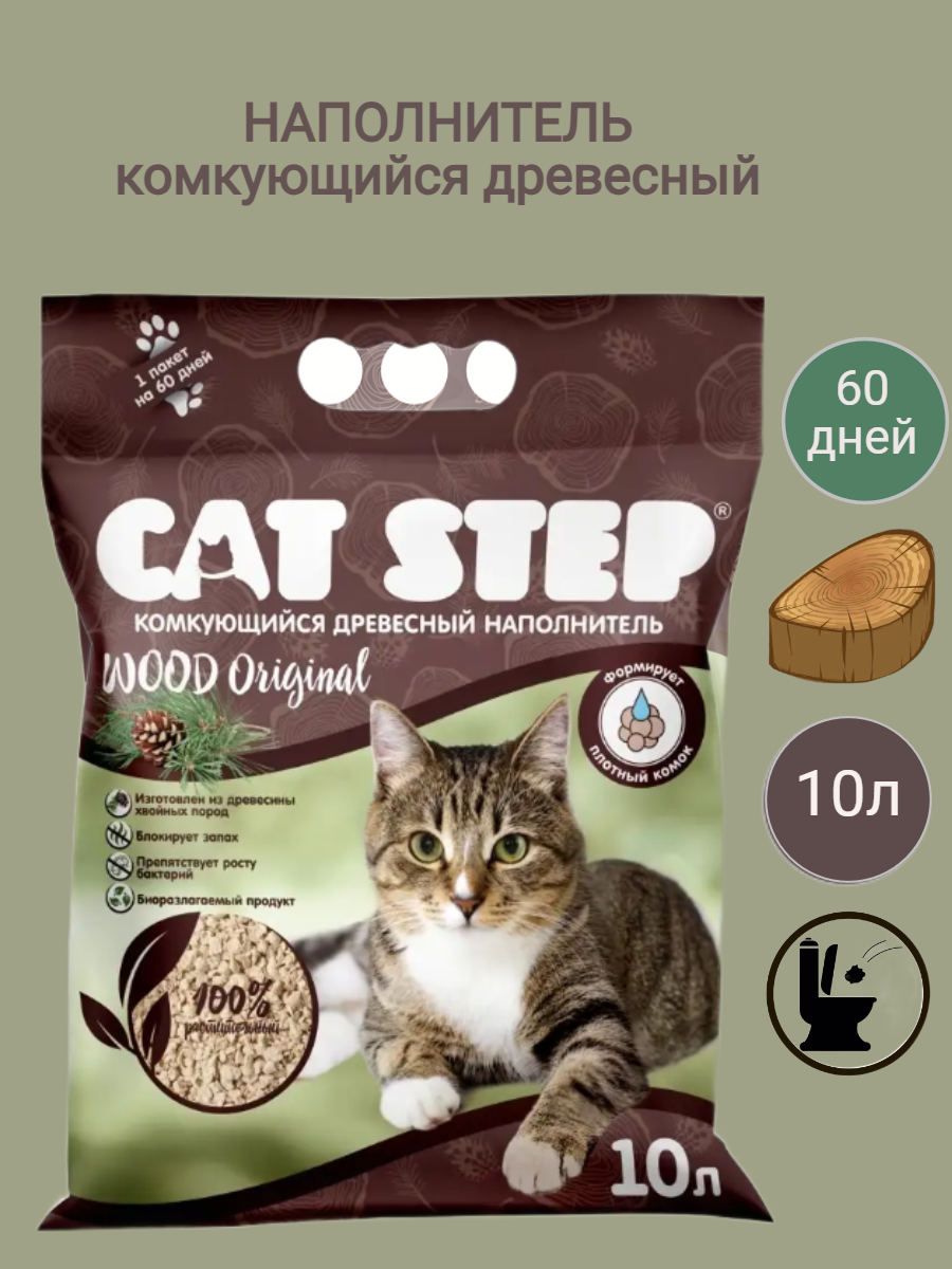 Наполнитель для кошачьего туалета комкующийся растительный CAT STEP Wood Original, 10 л