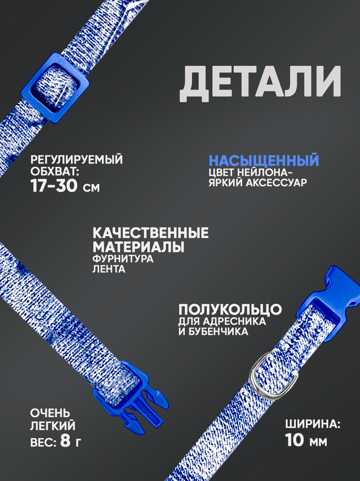 СохранитьОшейник для собак и кошек, ширина 10 мм, регулировка длины от 17 до 30 см, пластик, фастекс, лента (джинс) 70-0917 интересное: