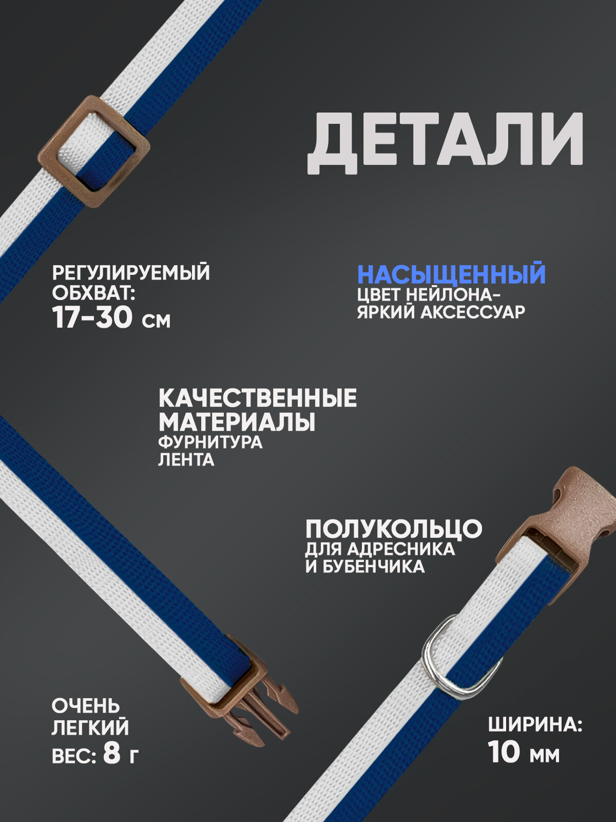 СохранитьОшейник для собак и кошек, ширина 10 мм, регулировка длины от 17 до 30 см, пластик, фастекс, лента (сине-серый) 70-0876 интересное: