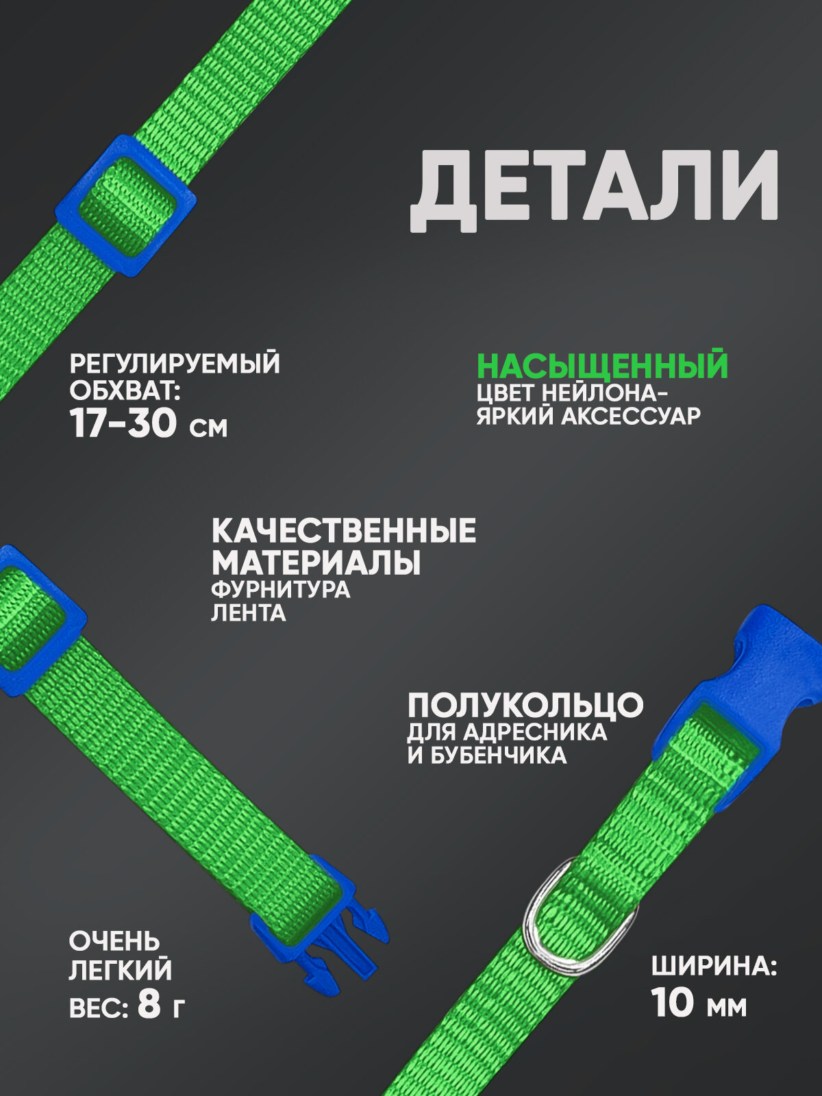 Купить Ошейник для собак и кошек, ширина 10 мм, регулировка длины от 17 до 30 см, пластик, фастекс, лента (зелёный) 70-0879