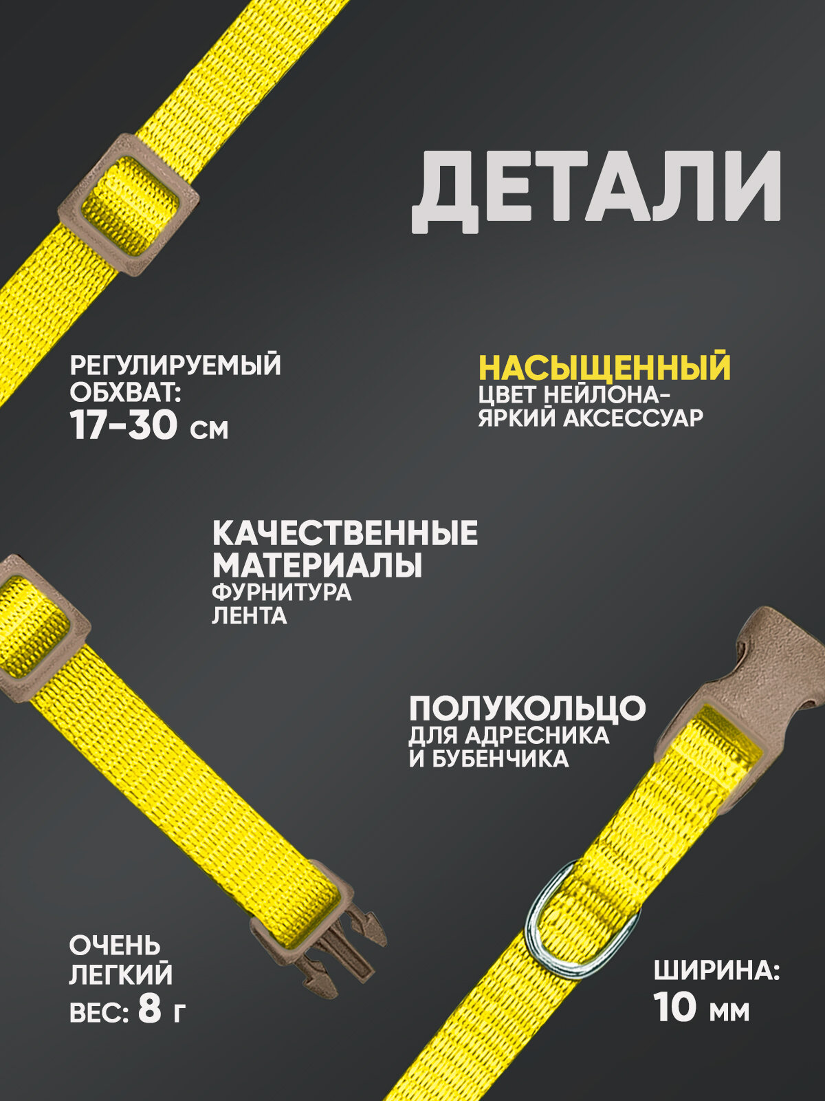 СохранитьОшейник для собак и кошек, ширина 10 мм, регулировка длины от 17 до 30 см, пластик, фастекс, лента (золотой) 70-0880 интересное: