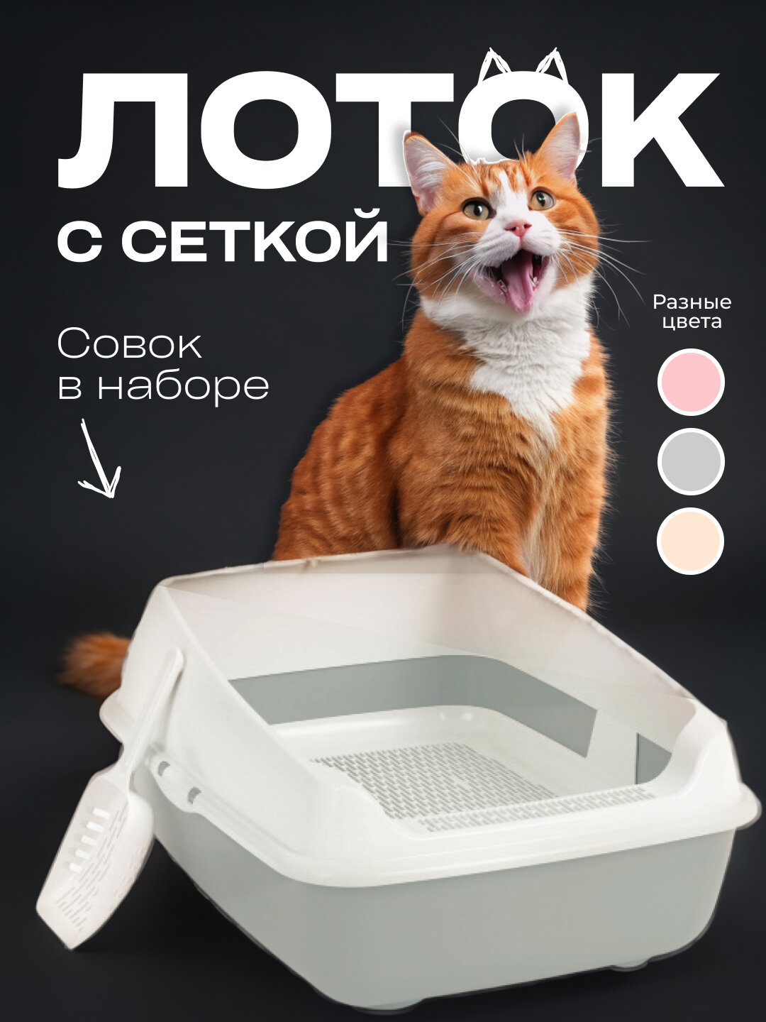 Набор для кошек (лоток с высокими бортами 50,5*39*23 см, сеткой и совком) (серый) интересное: