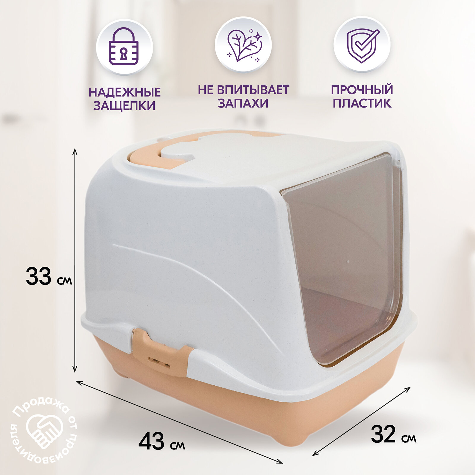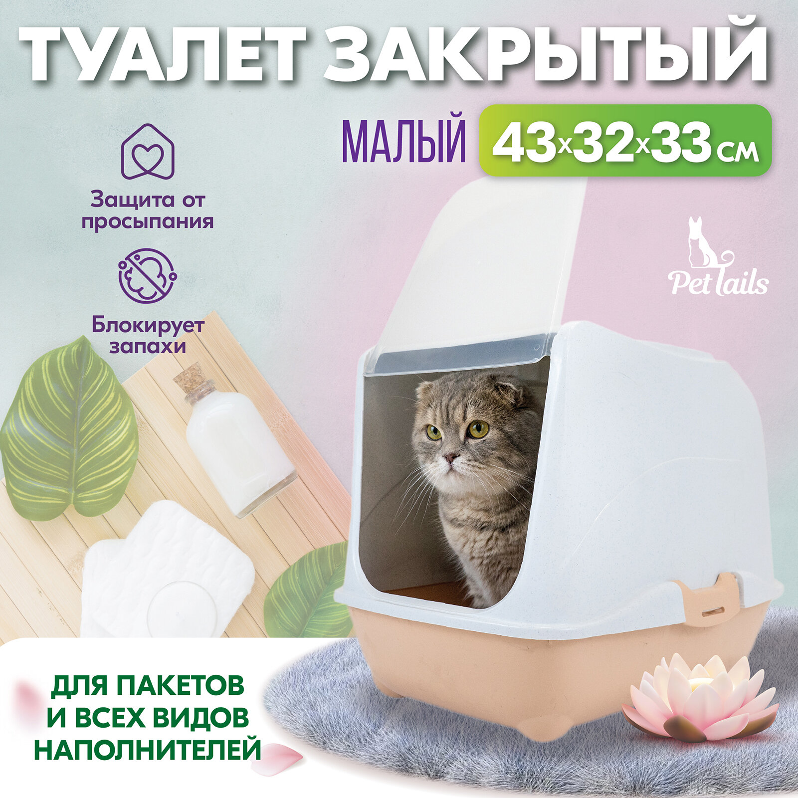 Купить Туалет-домик для кошек "PetTails" малый закрытый с дверцей 43*32*h33см (полипропилен) бежевый низ/мраморный верх