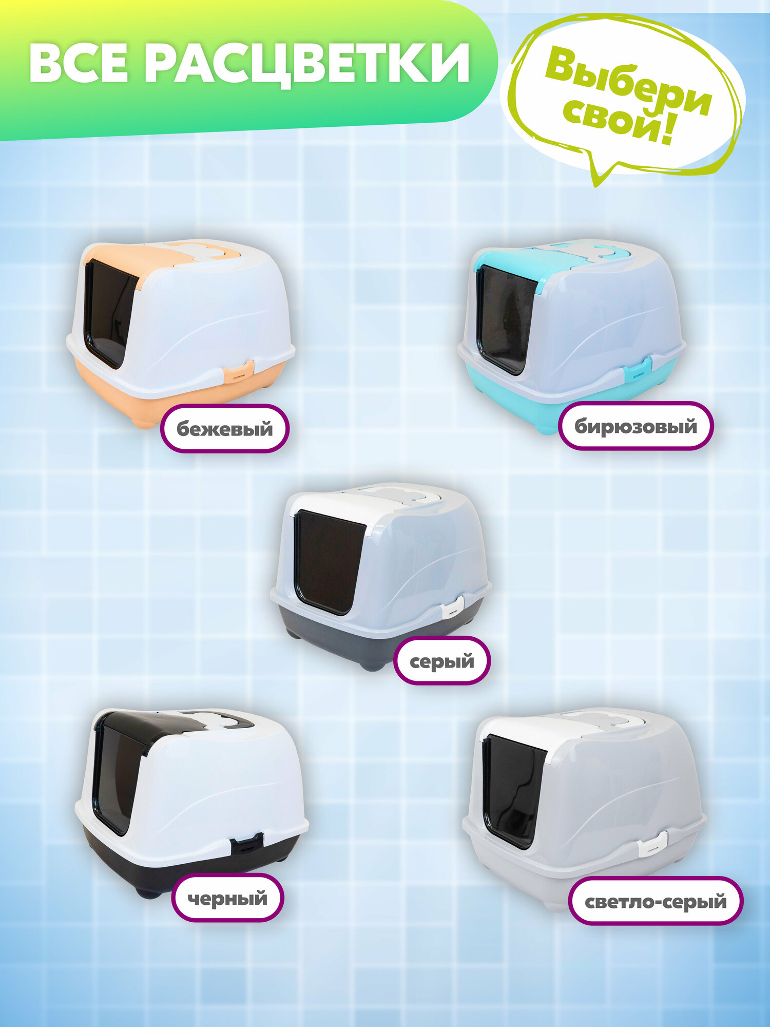 Купить Туалет-домик для кошек "PetTails" большой закрытый с дверцей 57*43*h38см (полипропилен), бирюзовый низ/серый верх