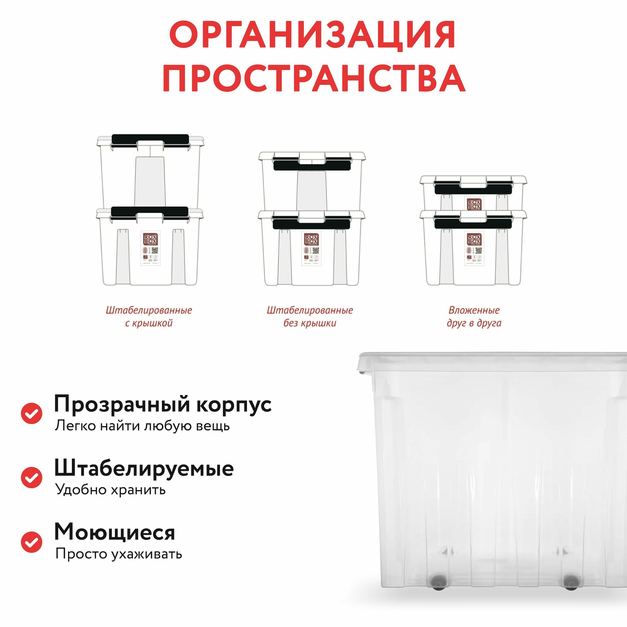 Ящик Rox Box п/п 589х396х355 мм 70Л с крышкой и клипсами, на роликах, прозр