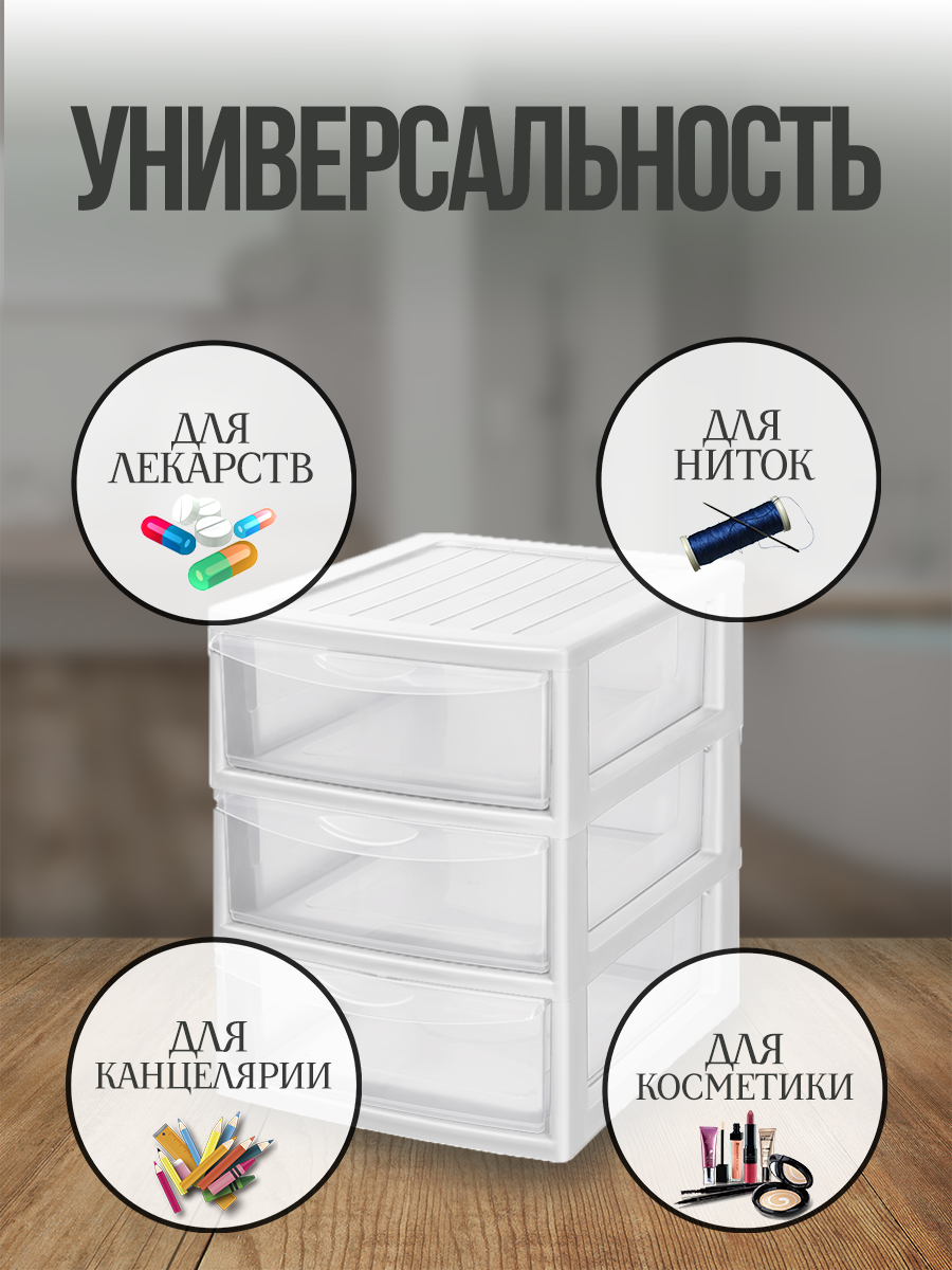 Купить Настольный органайзер для хранения мелочей 3 ящика . Мини-комод настольный универсальный 3 секции прозрачный/белый.