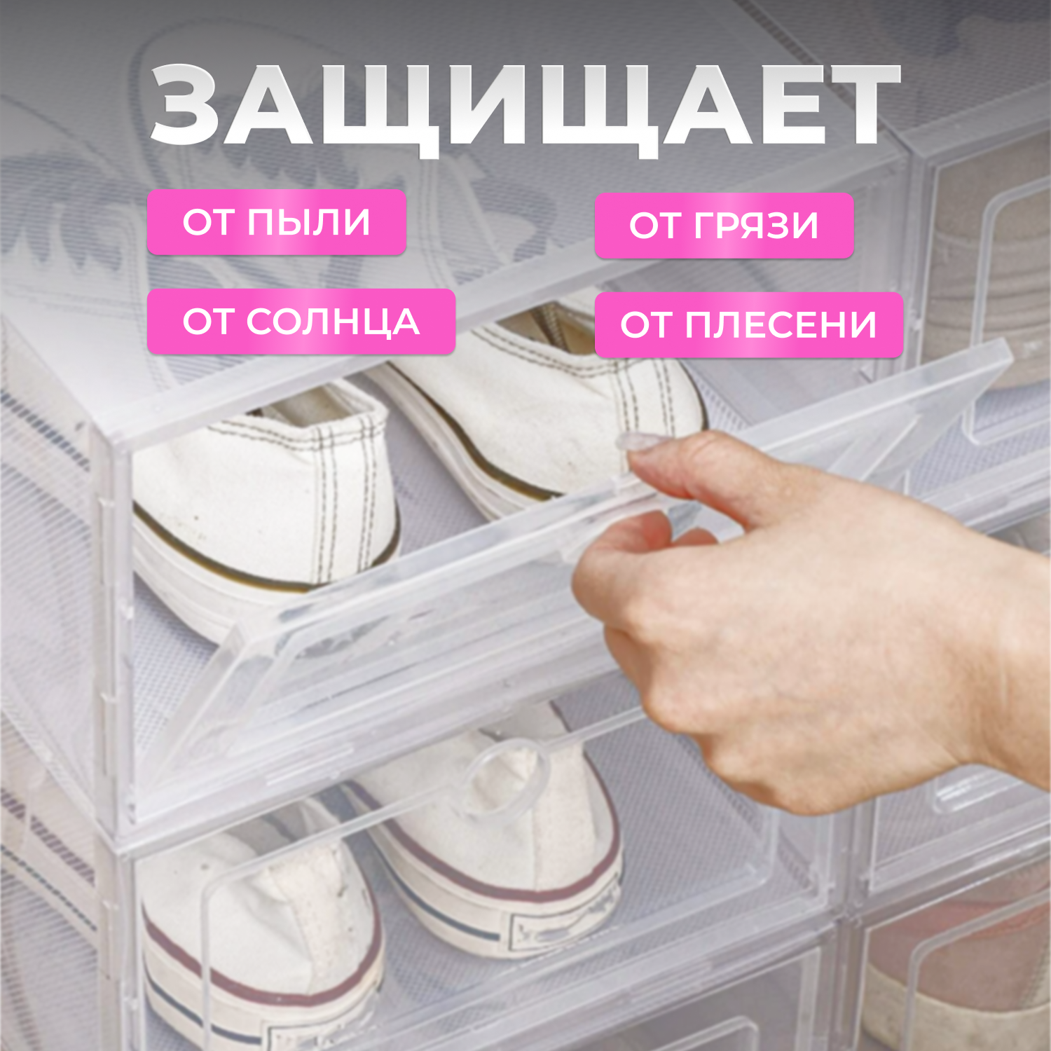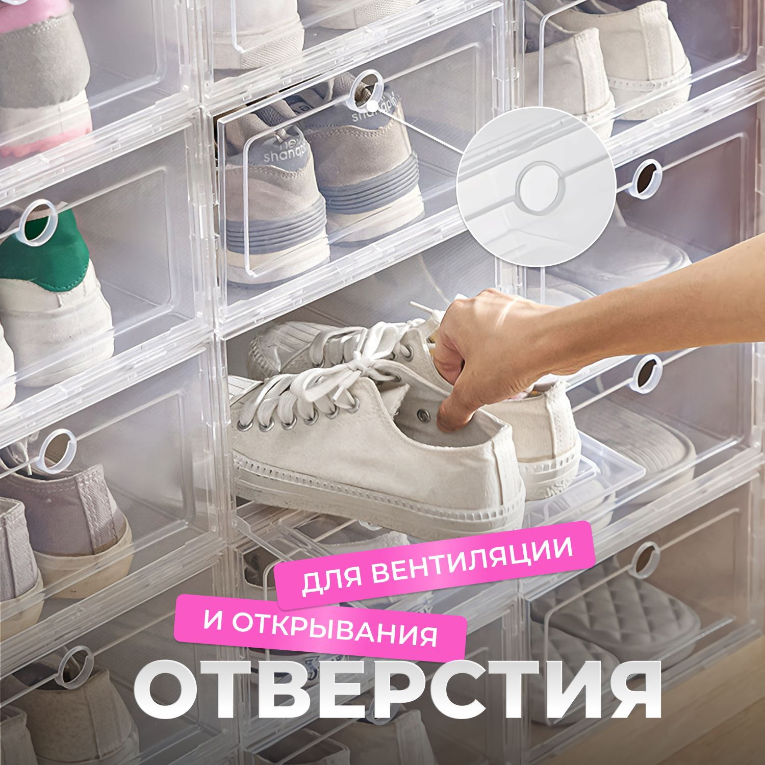 Коробки для хранения обуви прозрачные до 46 размера с отверстием, набор коробок 10 шт + 20 упаковок силикагеля, ящики премиальные для обуви на каблуке, контейнеры для хранения вещей интересное: