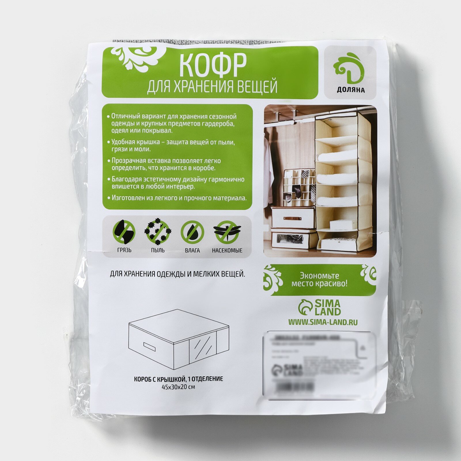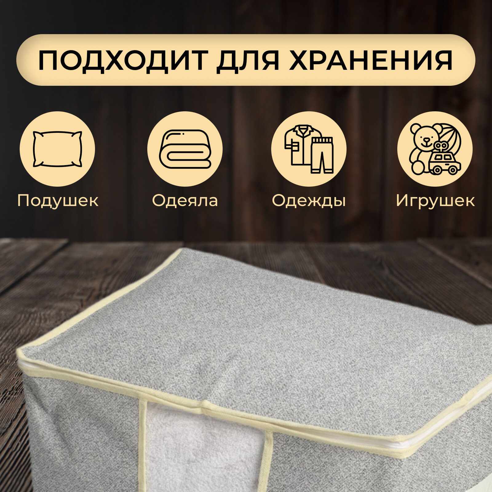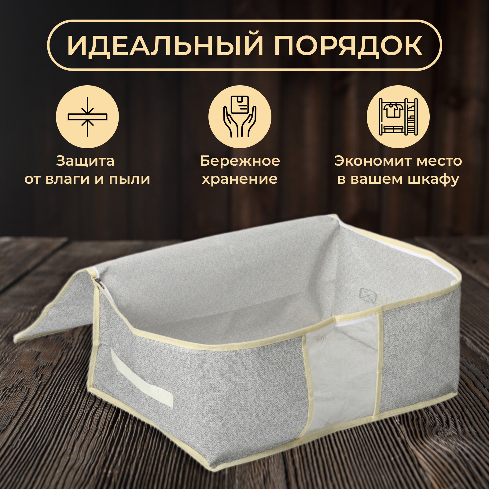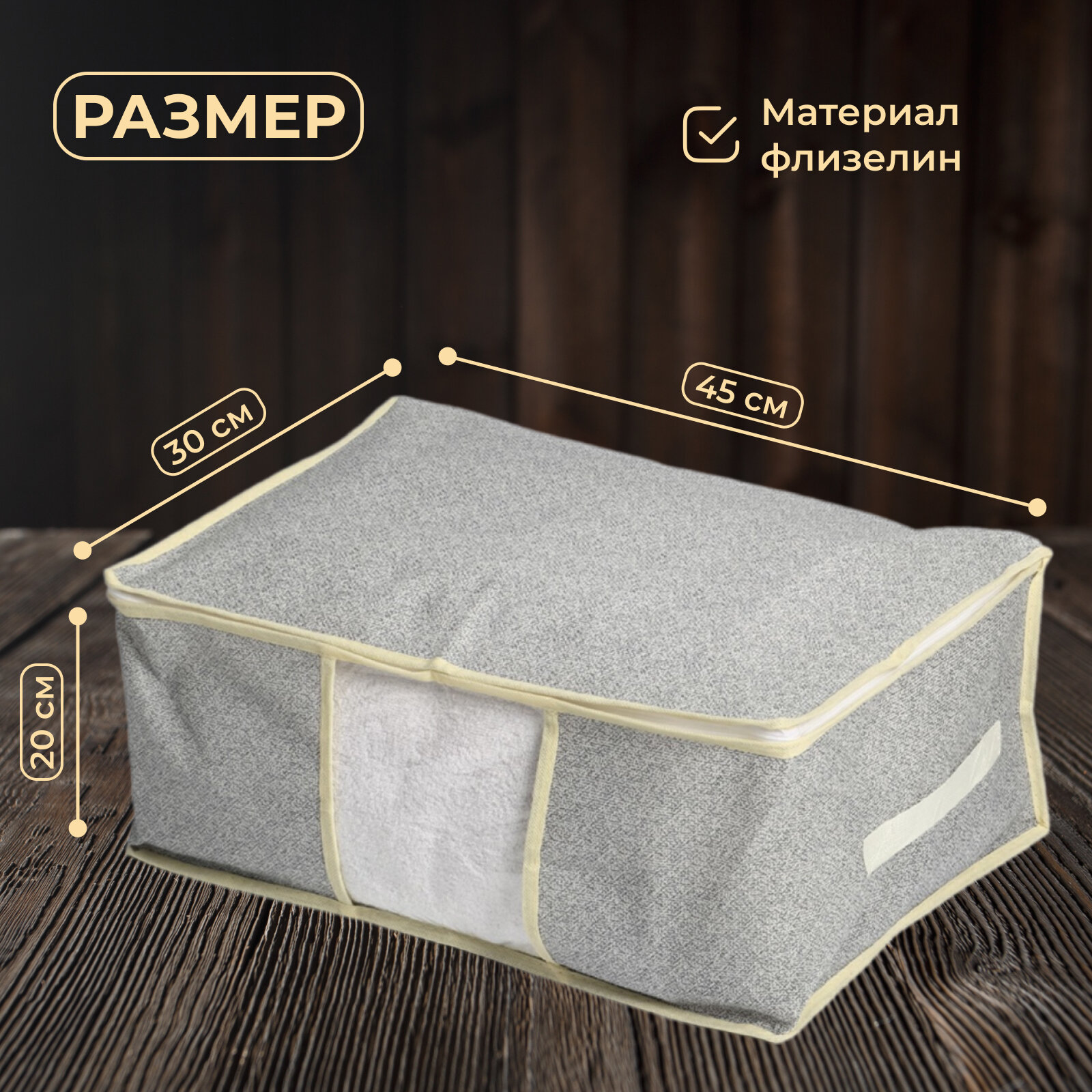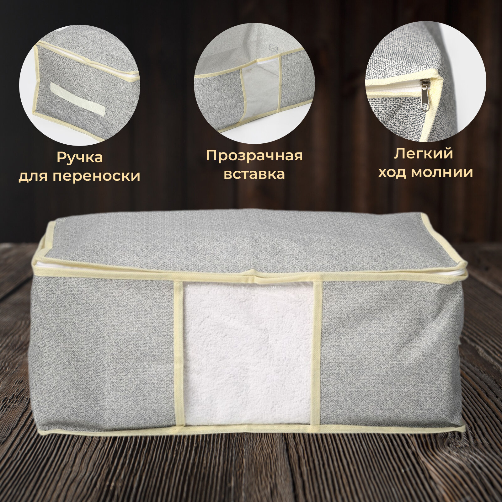 | Особенности | на молнии / плетеная / подвесная / подвесной / подкроватный / прозрачный / ручки для переноски / с крышкой / с разделителями / складной |