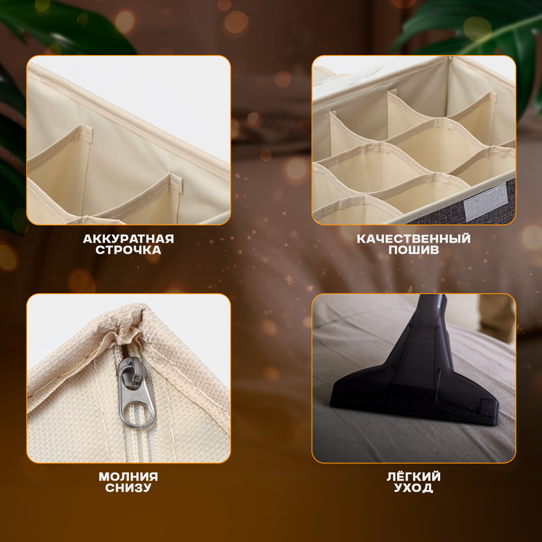 | Особенности | на молнии / плетеная / подвесная / подвесной / подкроватный / прозрачный / ручки для переноски / с крышкой / с разделителями / складной |