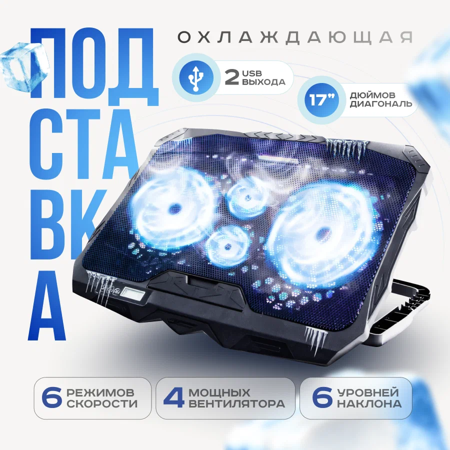 Подставка для ноутбука с подсветкой, 4 вентилятора, 2USB, 6 уровней наклона, 17.3"