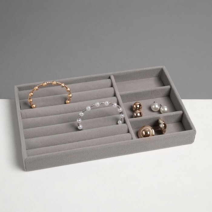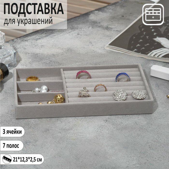 Купить Подставка для украшения 3 места и 7 полос для колец, флок, 21*12,3*2,5 см, цвет серый 9285213