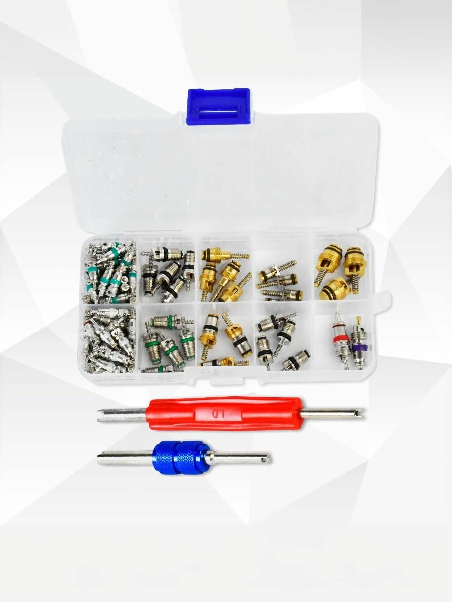 Купить Набор ниппелей (золотников) 100 шт, 9 видов, для сервисных заправочных портов автомобильных кондиционеров и авторефрижераторов.