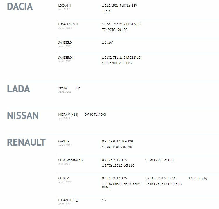 | Модель автомобиля | Dacia Duster / Great Wall Safe / LADA Vesta / LADA X-RAY / Lifan X50 / Nissan Micra / Renault Arkana / Renault Captur / Renault Clio / Renault Duster / Renault Kaptur / Renault Logan / Renault Logan Stepway / Renault Sandero |