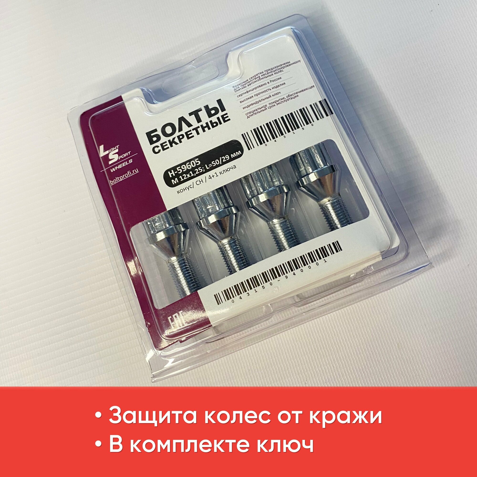 Купить Болты секретные на литые диски LADA М12 х 1,25, L= 50/ 29 мм, 4 шт + 1 ключ / Болты-секретки М12 х 1,25, 4 шт + 1 ключ