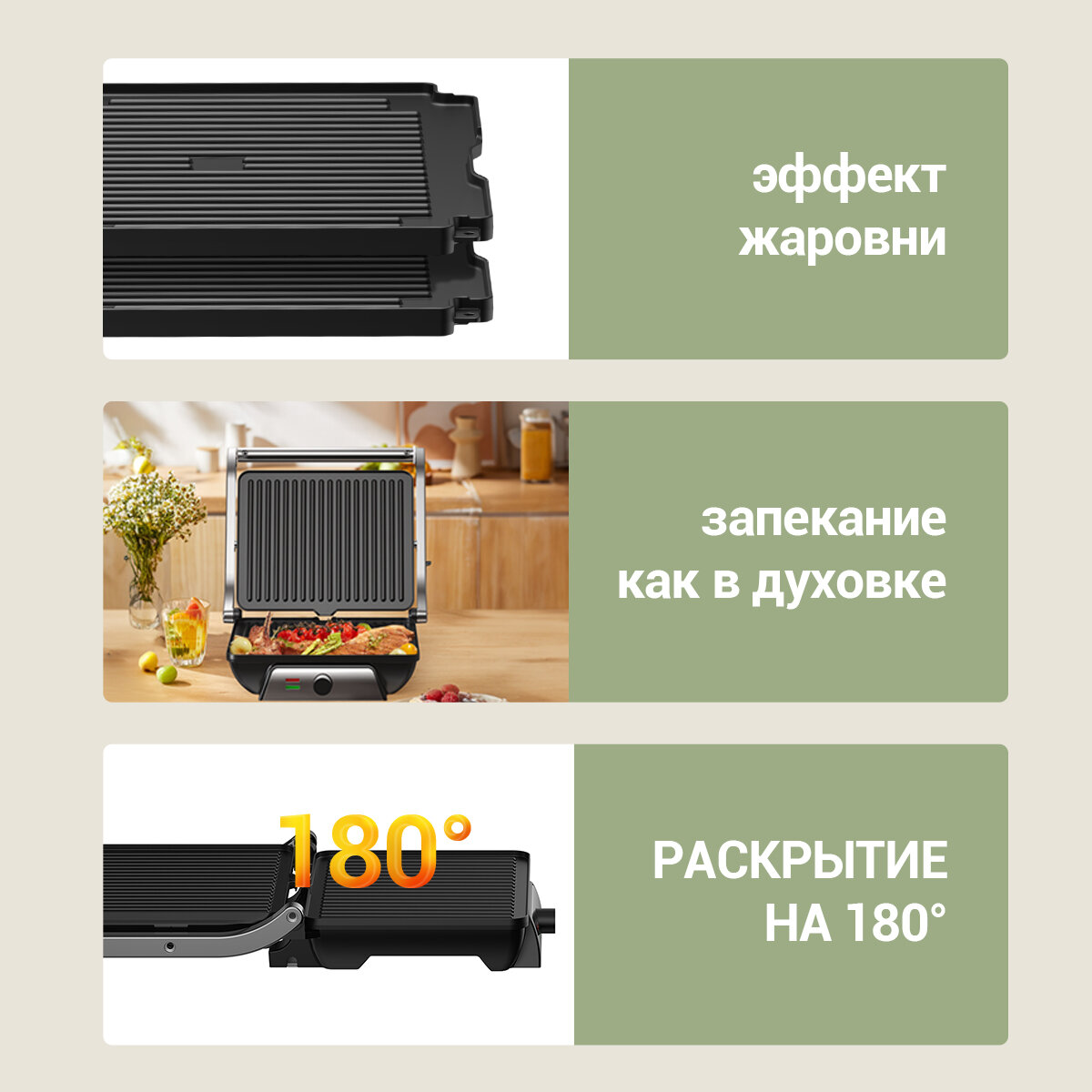 | Особенности | антипригарное покрытие / контактный гриль / поддон для сбора жира / регулировка высоты верхней панели / решетка |