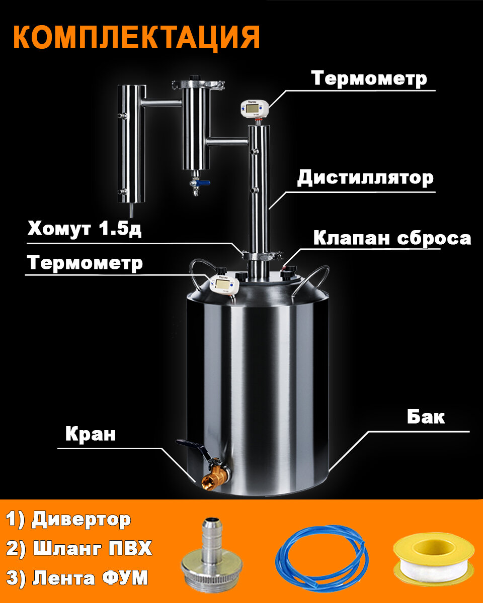 | Подробная комплектация | Перегонный куб. Дистиллятор. Кламповый хомут 1.5 дюйма. Кран на бак. Шланг пищевой (4 м) Переходник (дивертор) на кран. Лента ФУМ. Силиконовая прокладка под фланец. Предохранительный клапан. Гарантийный талон. Инструкция. Электронный термометр (2 шт) ЖЕТОН С ИНДИВИДУАЛЬНЫМ НОМЕРОМ |