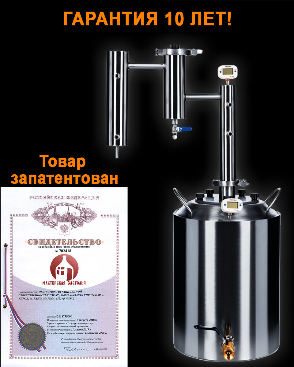 | Дополнительная информация | В комплекте с аппаратом Вы получите жетон с индивидуальным номером -защиту от подделок. После регистрации жетона вам гарантировано сервисное обслуживание аппарата в течении 10 лет. Также мы положили Вам 5 ПОДАРКОВ: корзинка для сухопарника, набор для настаивания, спиртомер, сетка Панченкова, книга рецептов |
