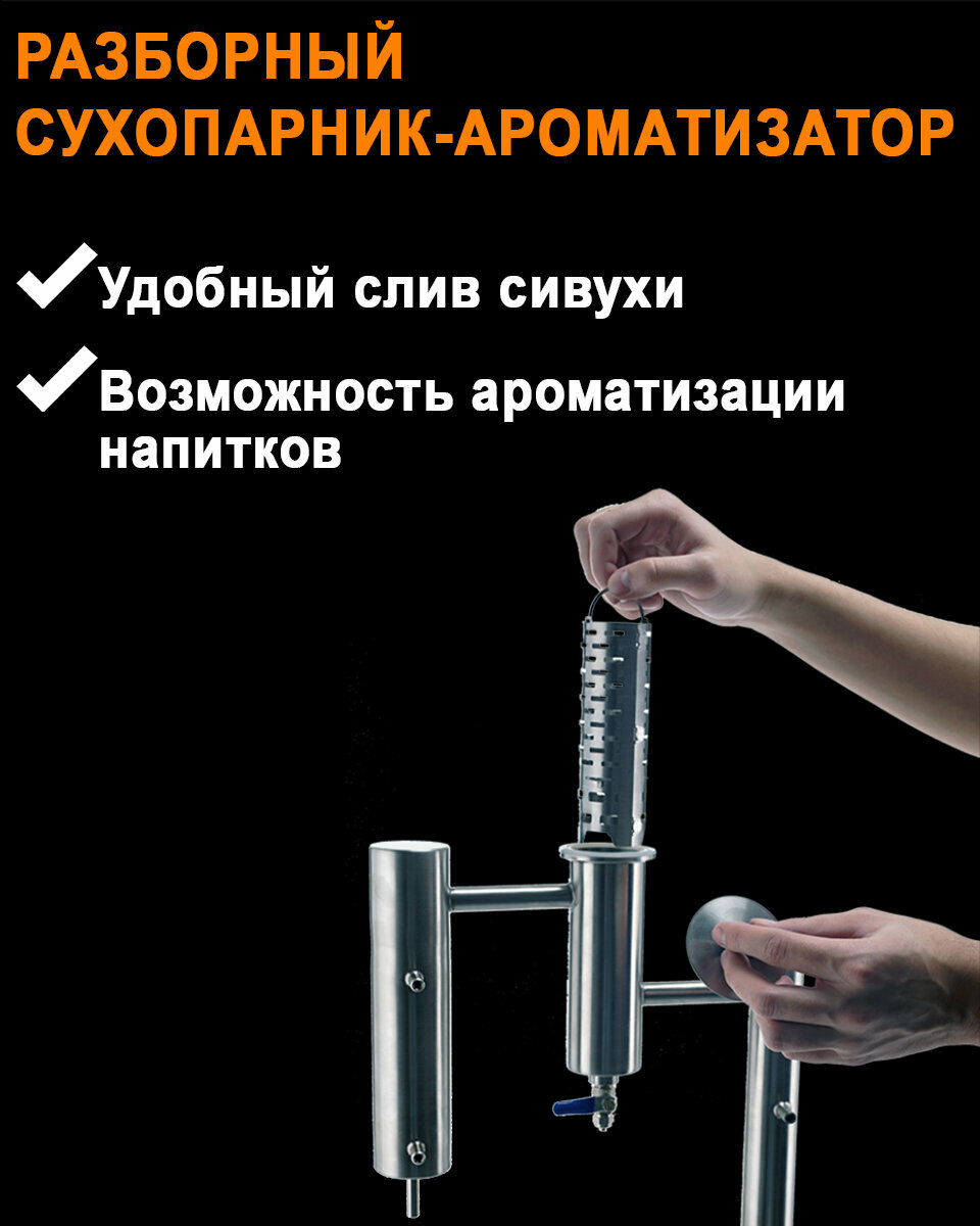 | Дополнительная информация | В комплекте с аппаратом Вы получите жетон с индивидуальным номером -защиту от подделок. После регистрации жетона вам гарантировано сервисное обслуживание аппарата в течении 10 лет. Также мы положили Вам 5 ПОДАРКОВ: корзинка для сухопарника, набор для настаивания, спиртомер, сетка Панченкова, книга рецептов |