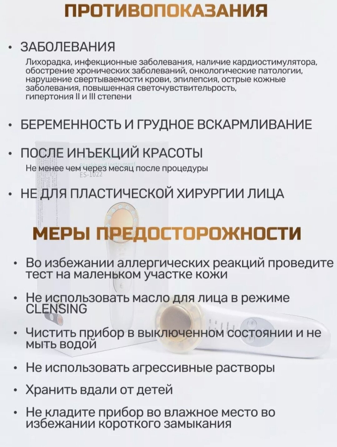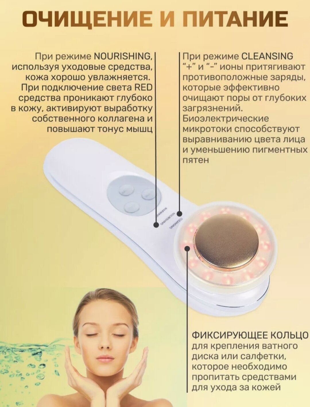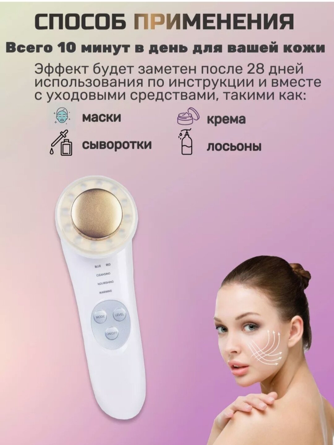 | Принцип работы | RF-лифтинг / ионизация / микротоки / миостимуляция |