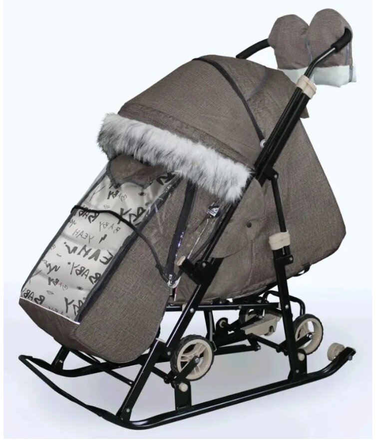 Санки-коляска SNOW GALAXY Glory Gloss лён коричневый крупный на больших колесах+сумка+варежки