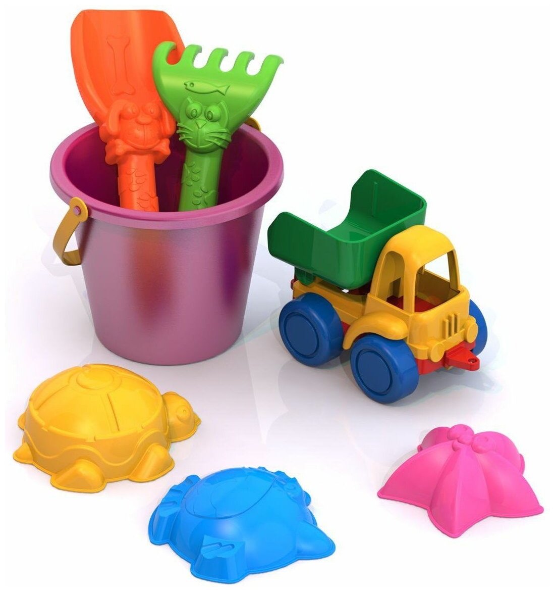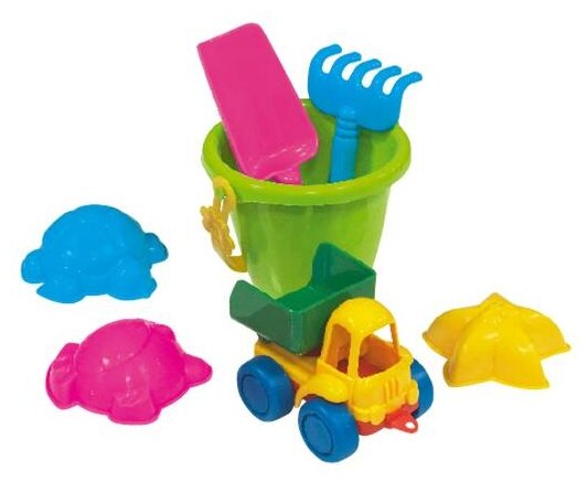 Купить Набор для песка №34 (Самосвал Нордик +совок Собачка +грабли Котенок +формочки Морские 3 шт.+ведро малое) 16х12х11 см