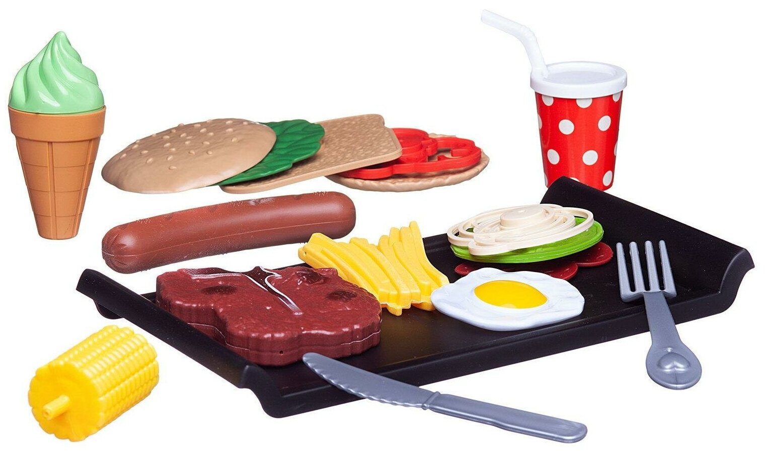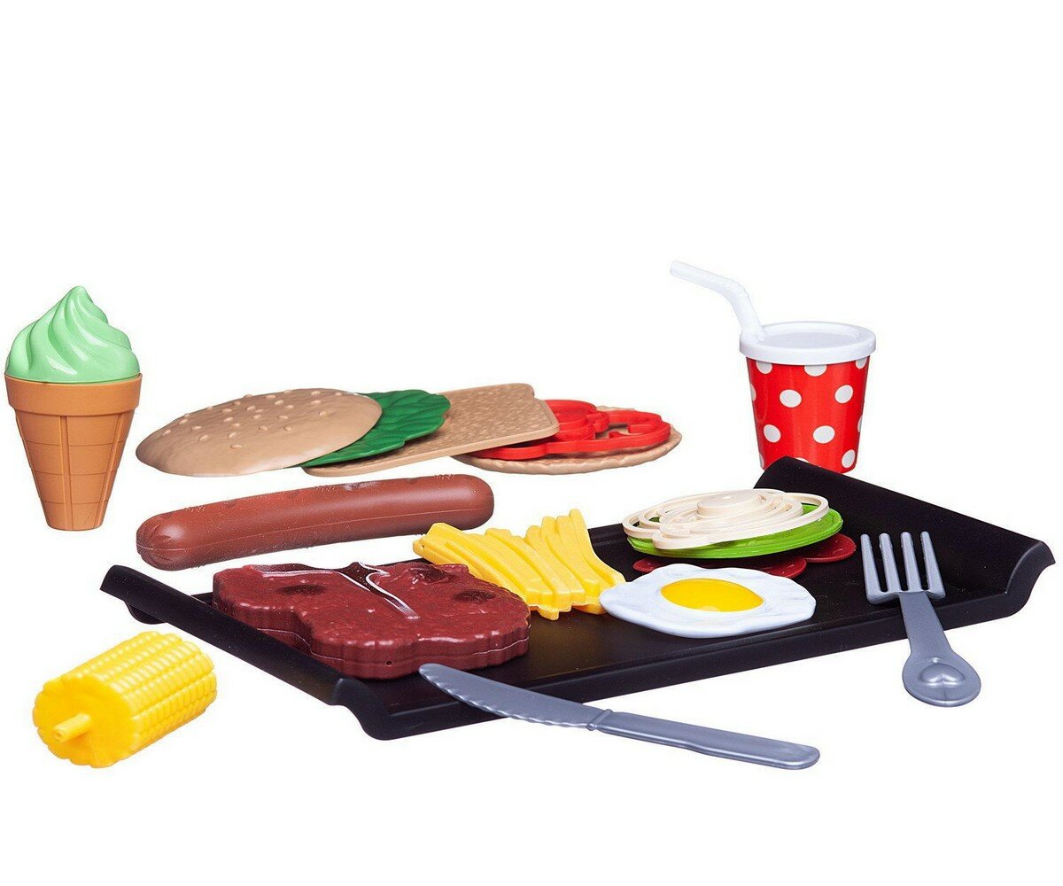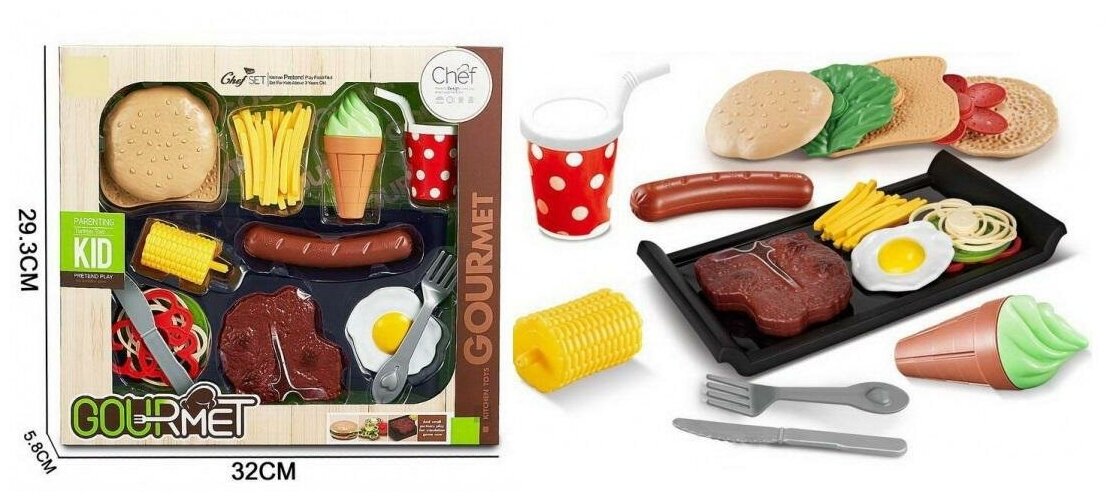 | Комплектация | тарелка, стейк, картошка фри, яичница, овощи нарезка – 3 шт., бургер – 5 шт., сосиска, кукуруза, мороженное, стакан, вилка, нож. |