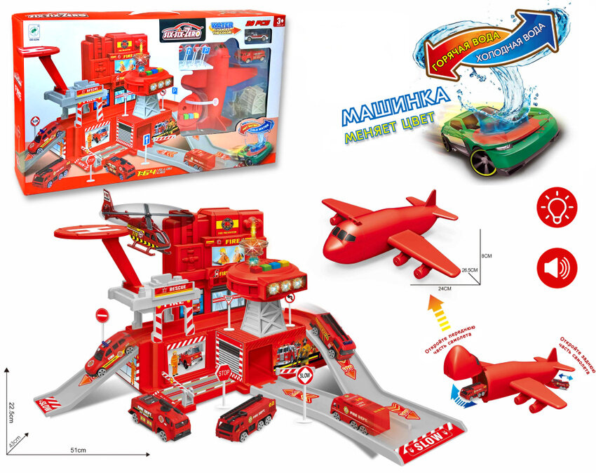 Детский игровой набор Парковка Fire Garage, самолет, 2 машинки 1:64, дорожные знаки, звуковое сопровождение, подсветка, пожарная стоянка, гараж, 51х интересное: