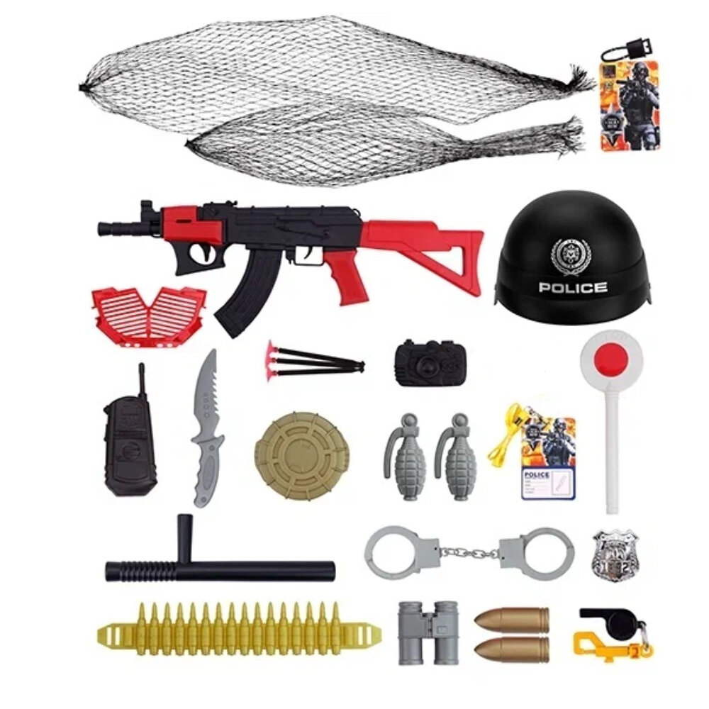 | В комплекте | бинокль, видеокамера, граната, жилет, значок, каска, наручники, оружие, очки, рация, удостоверение, фонарь |
