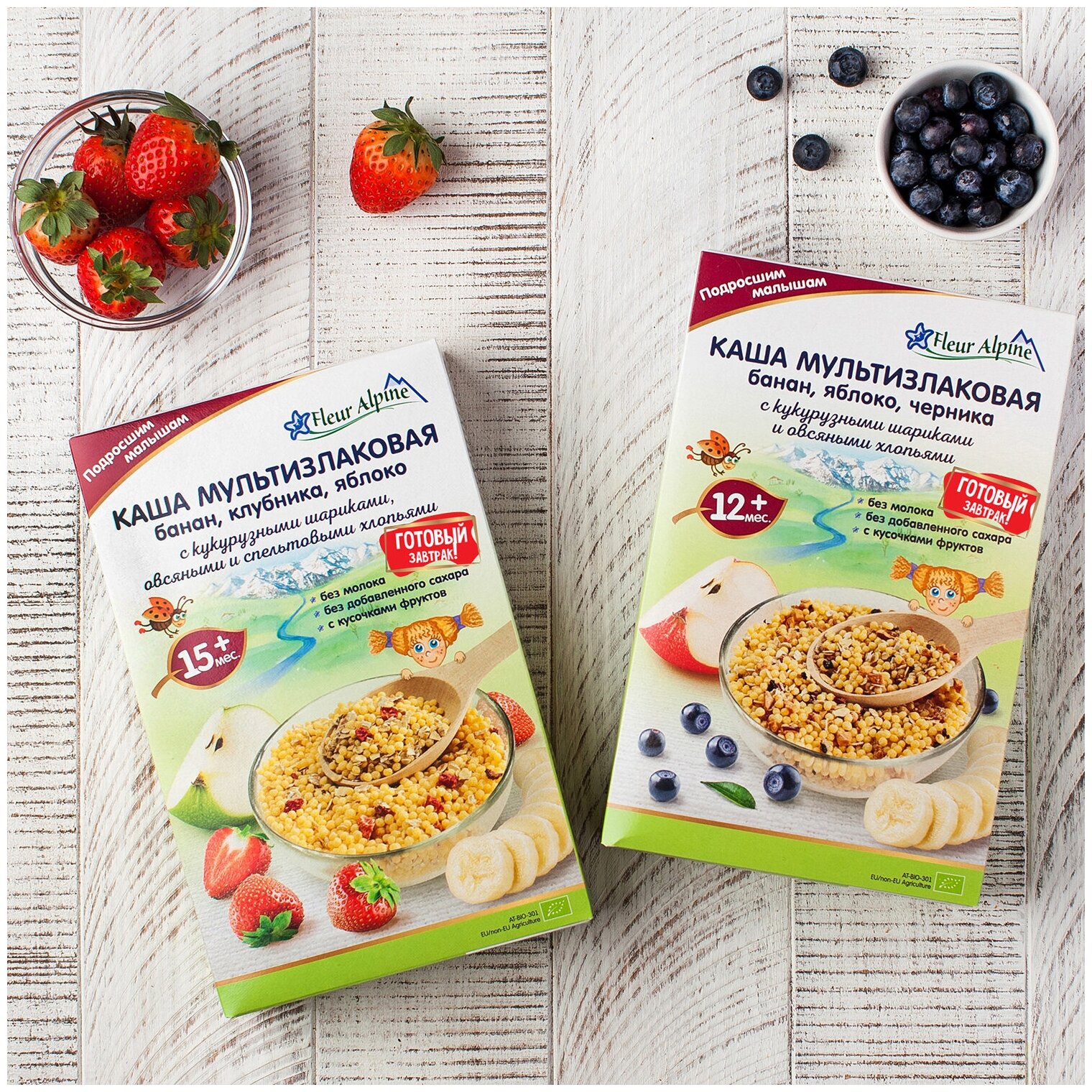 Купить Каша Fleur Alpine мультизлаковая банан, клубника, яблоко с кукурузными шариками, овсяными и спельтовыми хлопьями, с 15 месяцев, 200 г