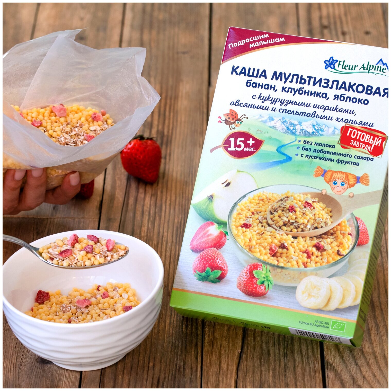 Каша Fleur Alpine мультизлаковая банан, клубника, яблоко с кукурузными шариками, овсяными и спельтовыми хлопьями, с 15 месяцев, 200 г интересное: