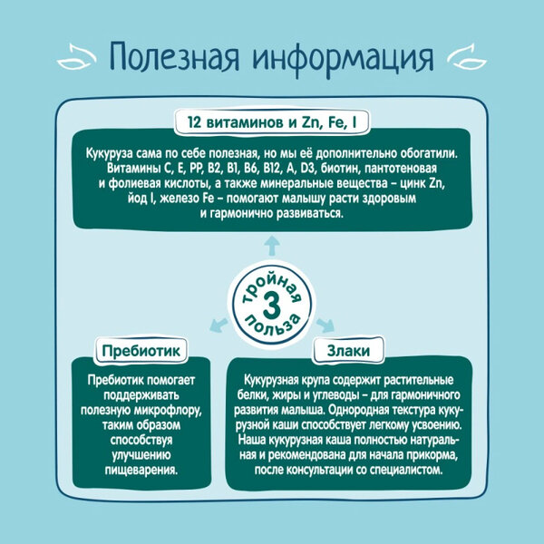 | Состав | мука кукурузная, пребиотик-инулин, витамины (С, Е, РР, пантотеновая кислота, В1, В2, В6, А, фолиевая кислота, D3, биотин, В12), минеральные вещества (железо, цинк, йод) |