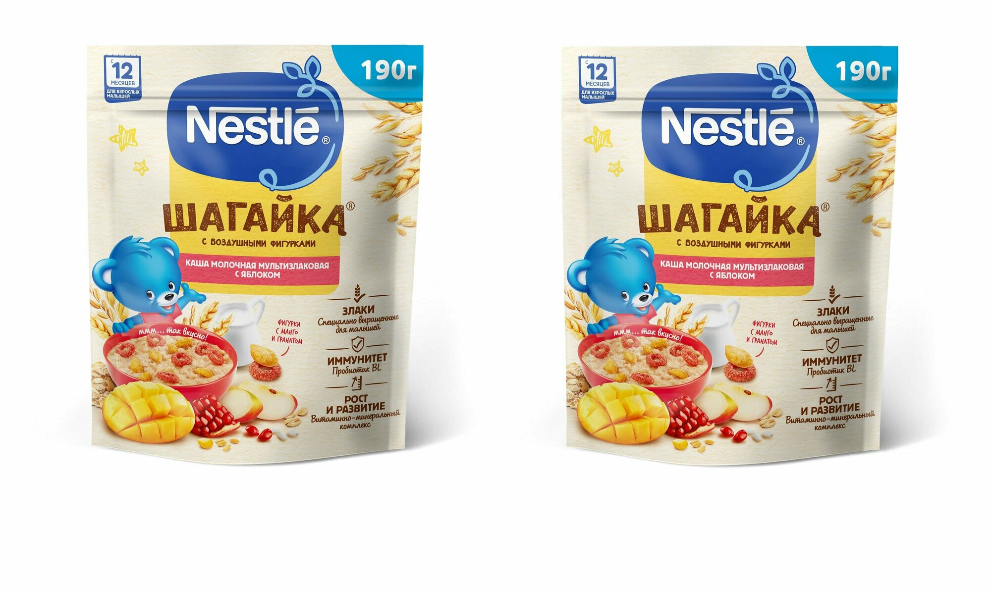Каша Nestle Шагайка молочная мультизлаковая с яблоком, кусочками абрикоса и фигурками из пшеницы с натуральным соком граната 190г 2 шт
