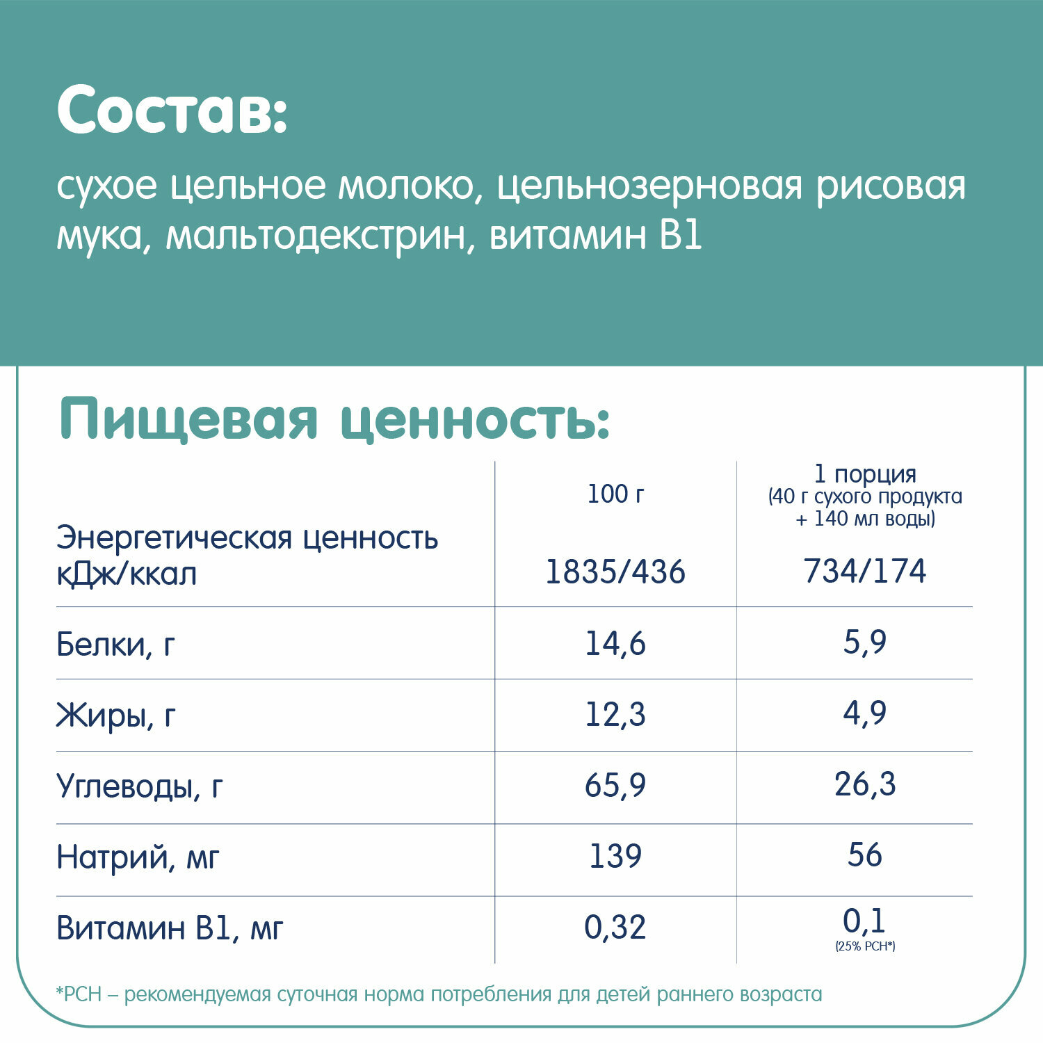 | Состав | сухое цельное молоко*, цельнозерновая рисовая мука*, мальтодекстрин*, витамин В1 *органическое сельское хозяйство соответствует законодательству ЕС (Регламенты ЕС №834/2007, №889/2008) |