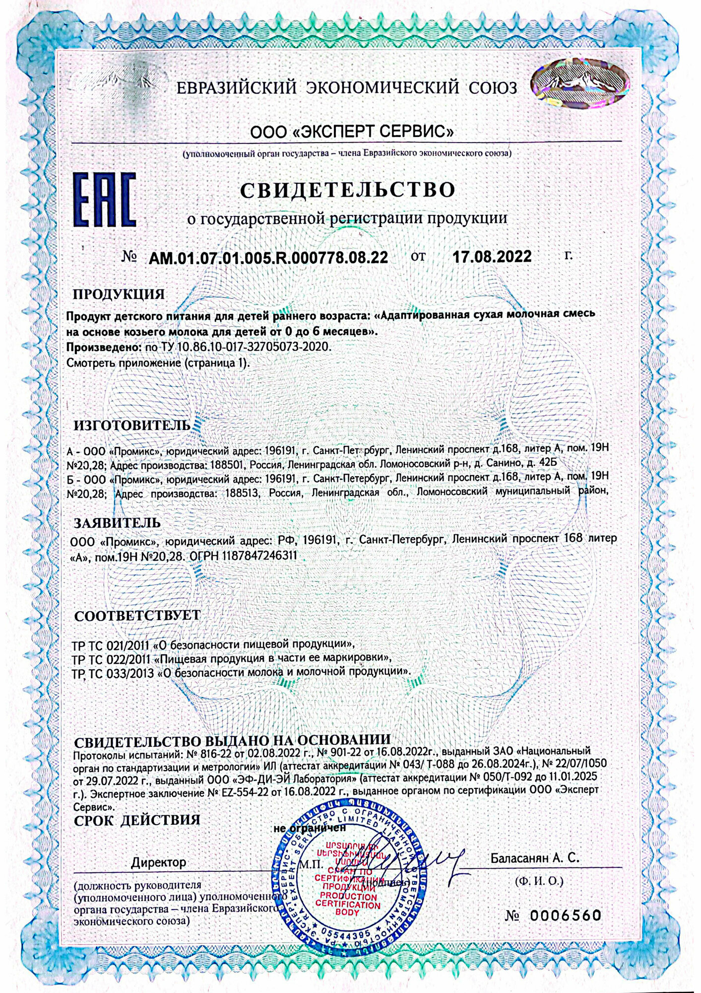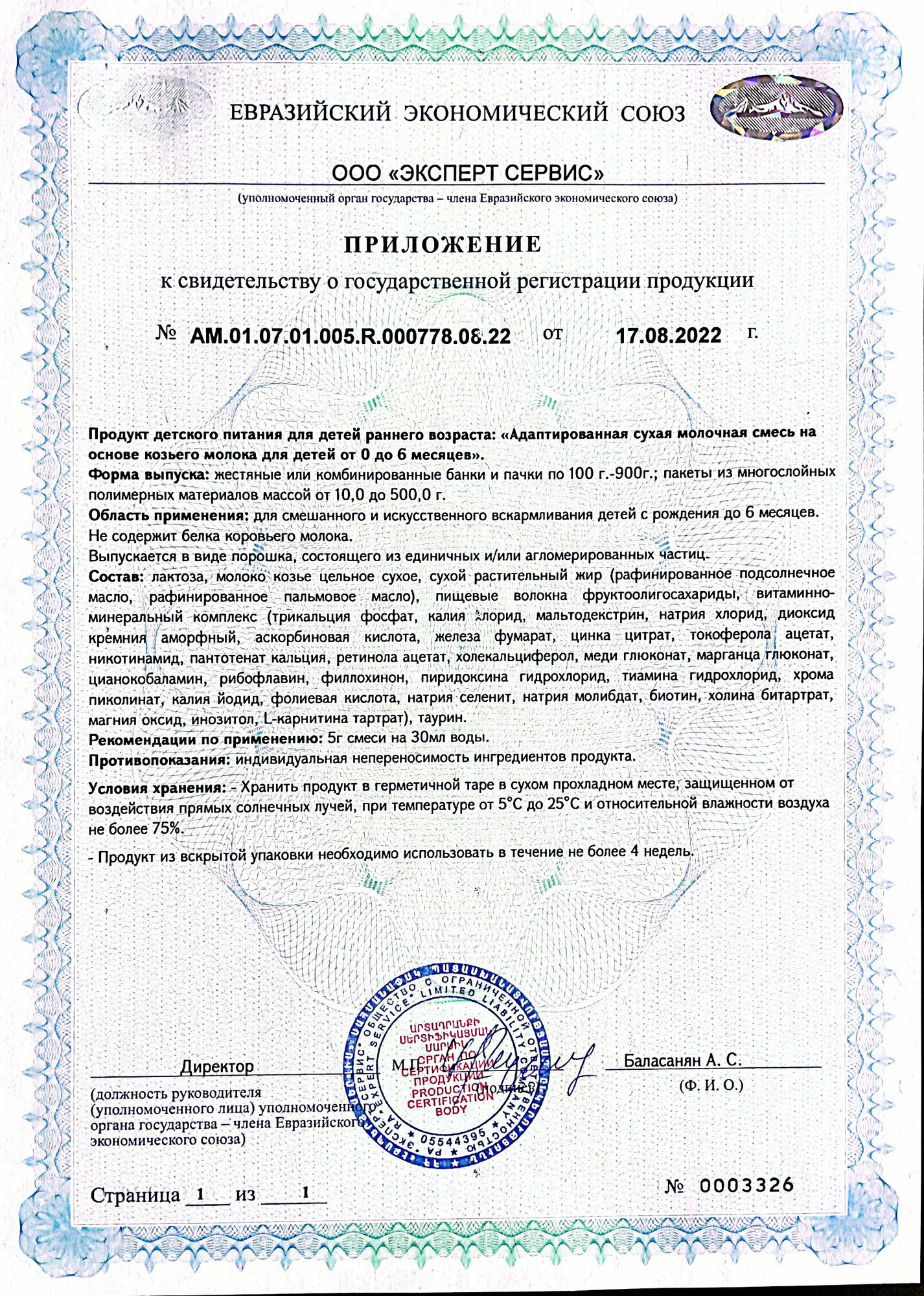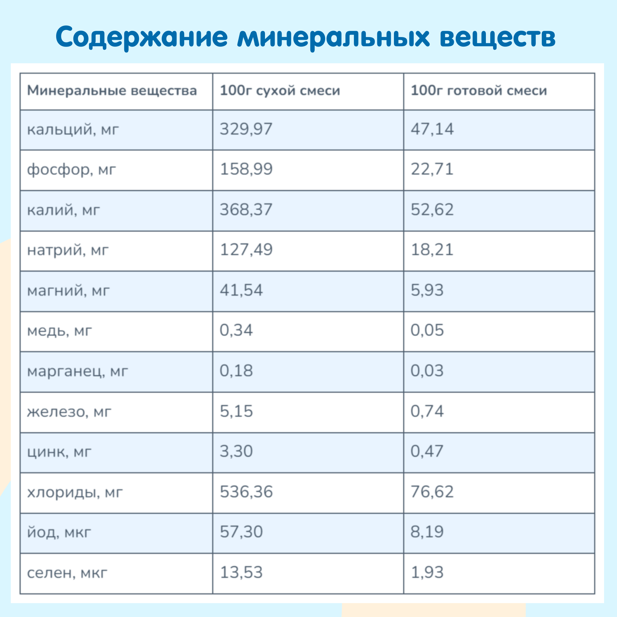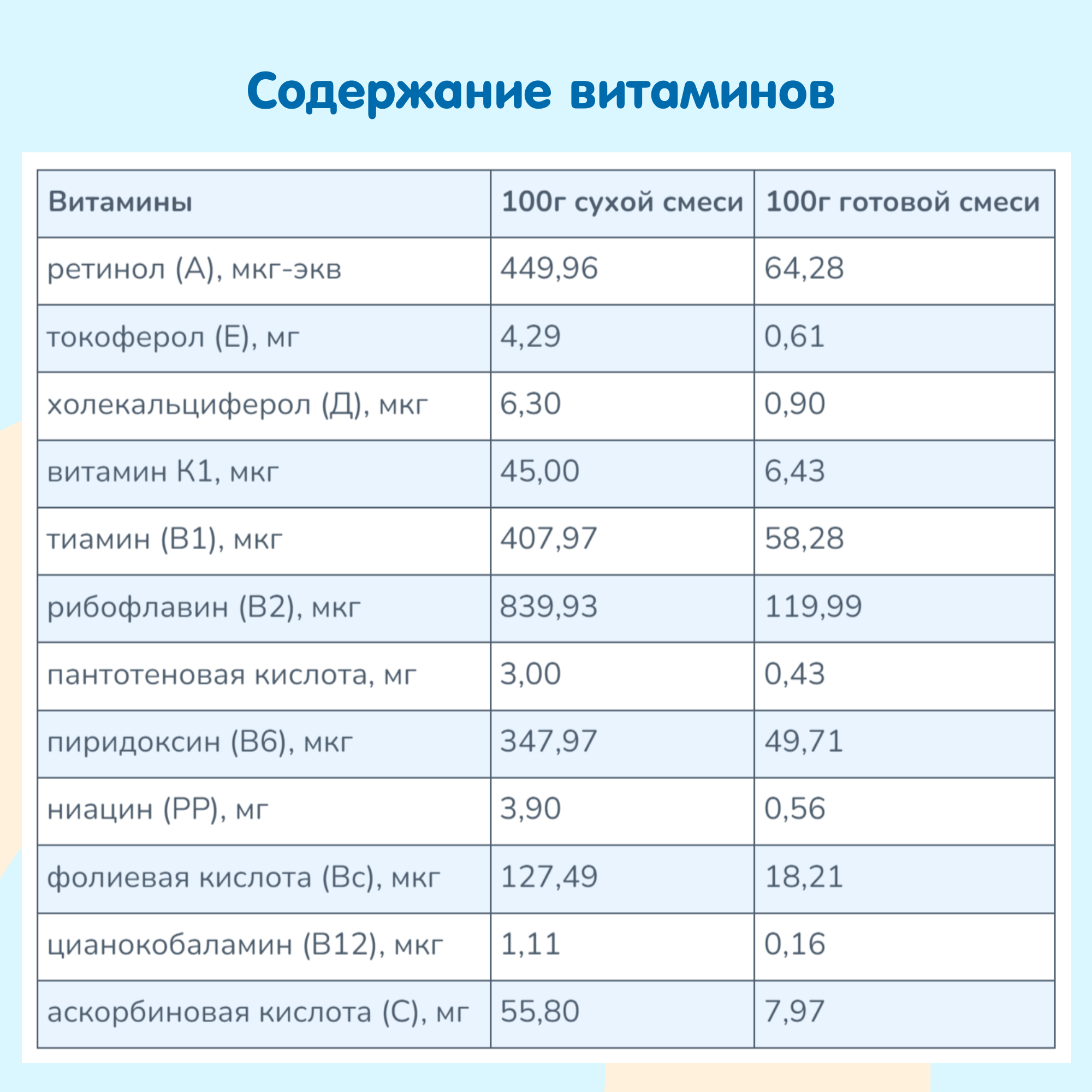 | Состав | Лактоза, молоко козье цельное сухое, сухой растительный жир (рафинированное подсолнечное масло, рафинированное пальмовое масло), пищевые волокна фруктоолигосахариды, витаминно-минеральный комплекс (трикальция фосфат, калия хлорид, мальтодекстрин, натрия хлорид, антислеживающий агент диоксид кремния аморфный, аскорбиновая кислота, железа фумарат, цинка цитрат, токоферола ацетат, никотинамид, пантотенат кальция, ретинола ацетат, холекальциферол, меди глюконат, марганца глюконат, цианокобаламин, рибофлавин, филлохинон, пиридоксина гидрохлорид, тиамина гидрохлорид, хрома пиколинат, калия йодид, фолиевая кислота, натрия селенит, натрия молибдат, биотин, холина битартрат, магния оксид, инозитол, L-карнитина тартрат), таурин. |