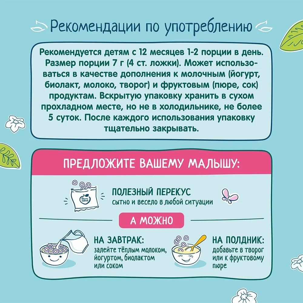 | Дополнительная информация | может использоваться в качестве дополнения к молочным (йогурт, биолакт, молоко, творог) и фруктовым (пюре, сок) продуктам, вскрытую упаковку хранить в сухом прохладном месте, но не в холодильнике, не более 5 суток |