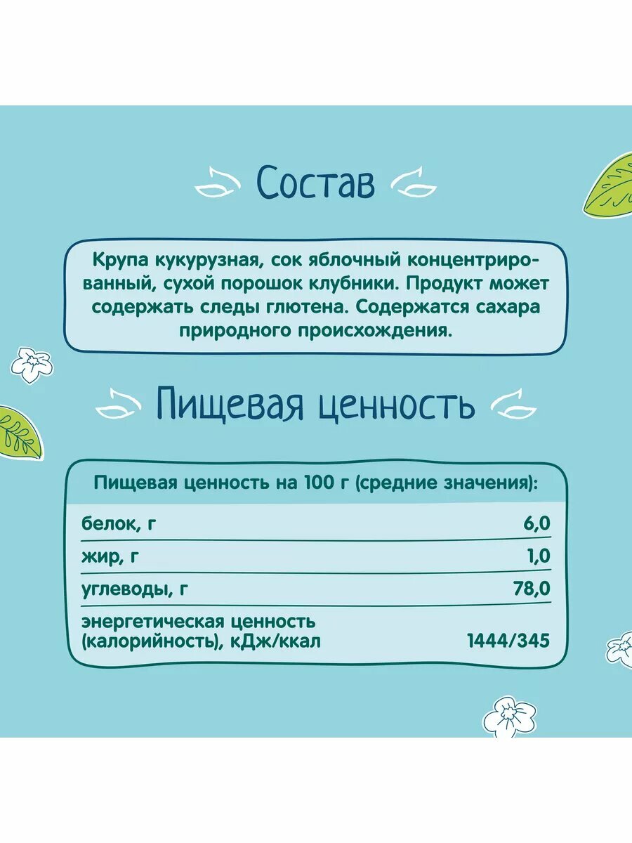 | Состав | Крупа кукурузная, сок яблочный концентрированный, сухой порошок клубники. |
