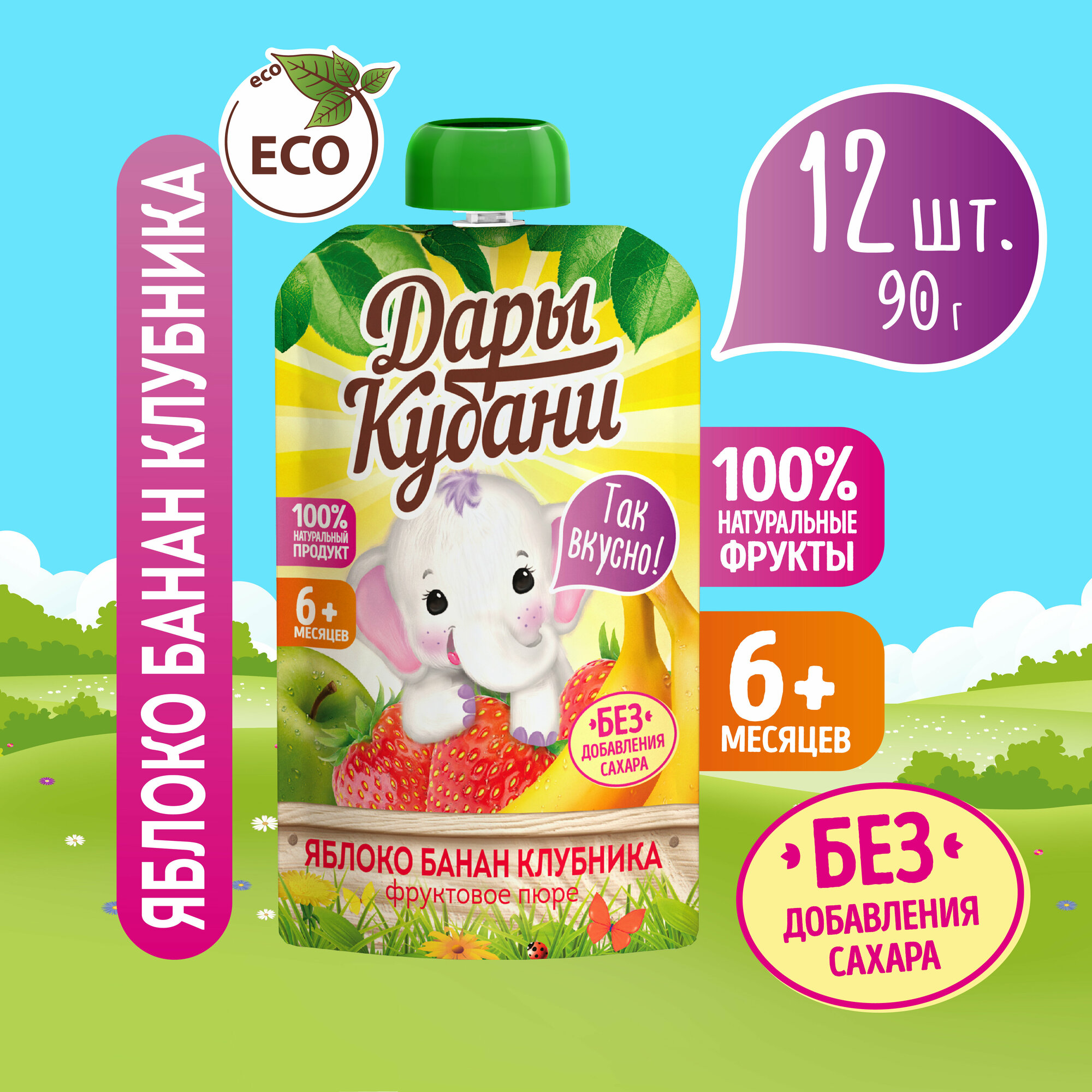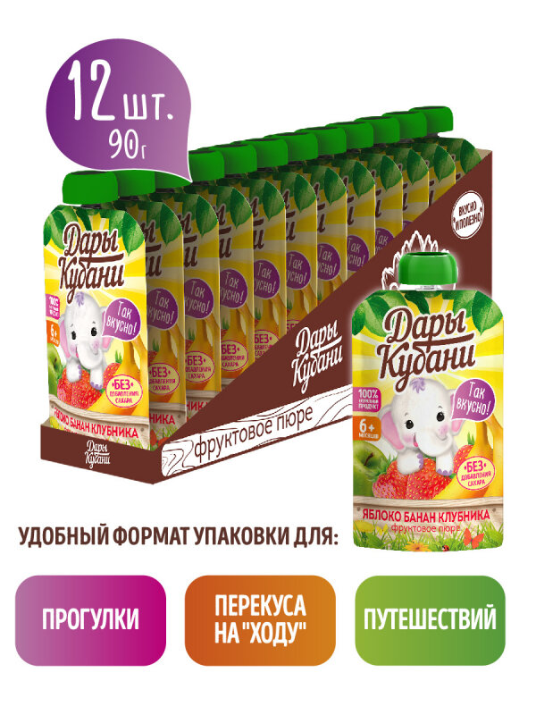 Купить Детское пюре Дары Кубани из яблок, бананов и клубники, без сахара, для питания детей с 6 месяцев, 90 г х 12 шт.