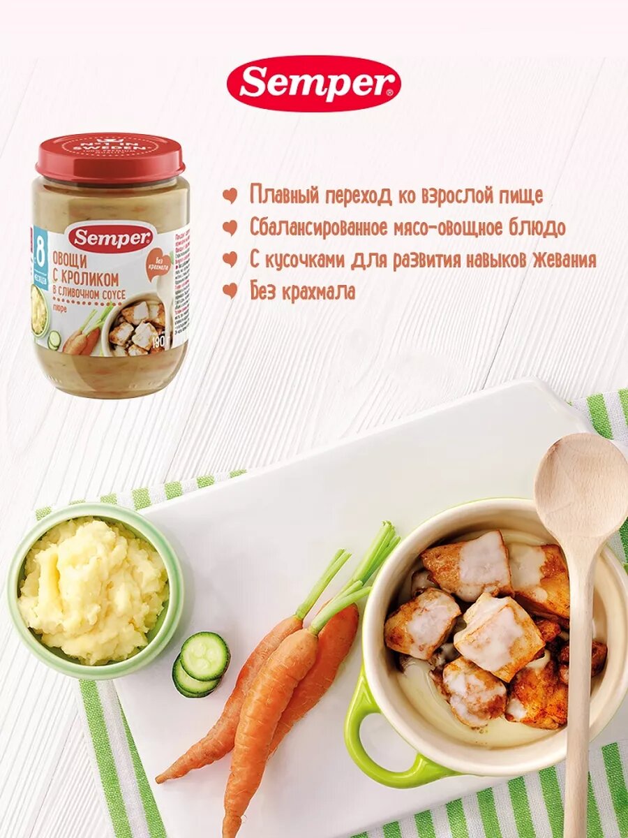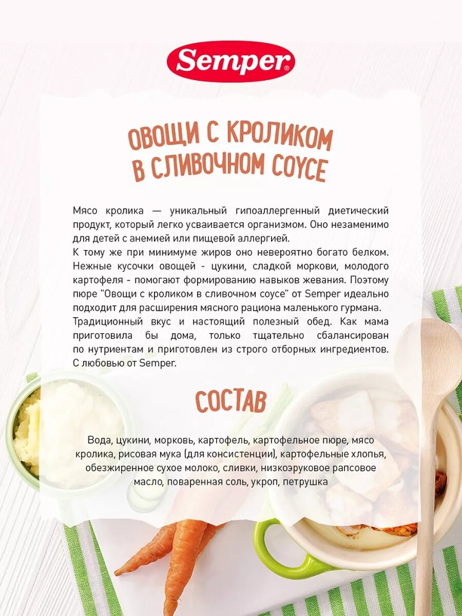 Пюре SEMPER овощи-кролик-сливочный соус с 8 месяцев 190г интересное: