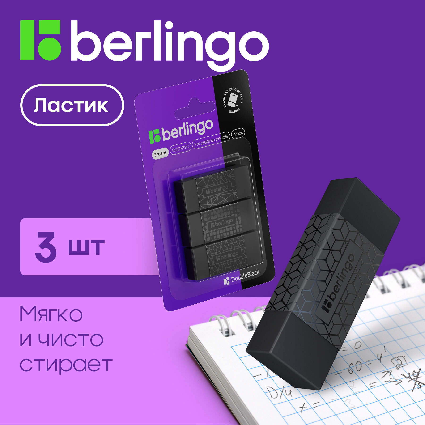 Купить Ластик Berlingo "DoubleBlack", 3шт, прямоугольные, 50*18*10мм, блистер