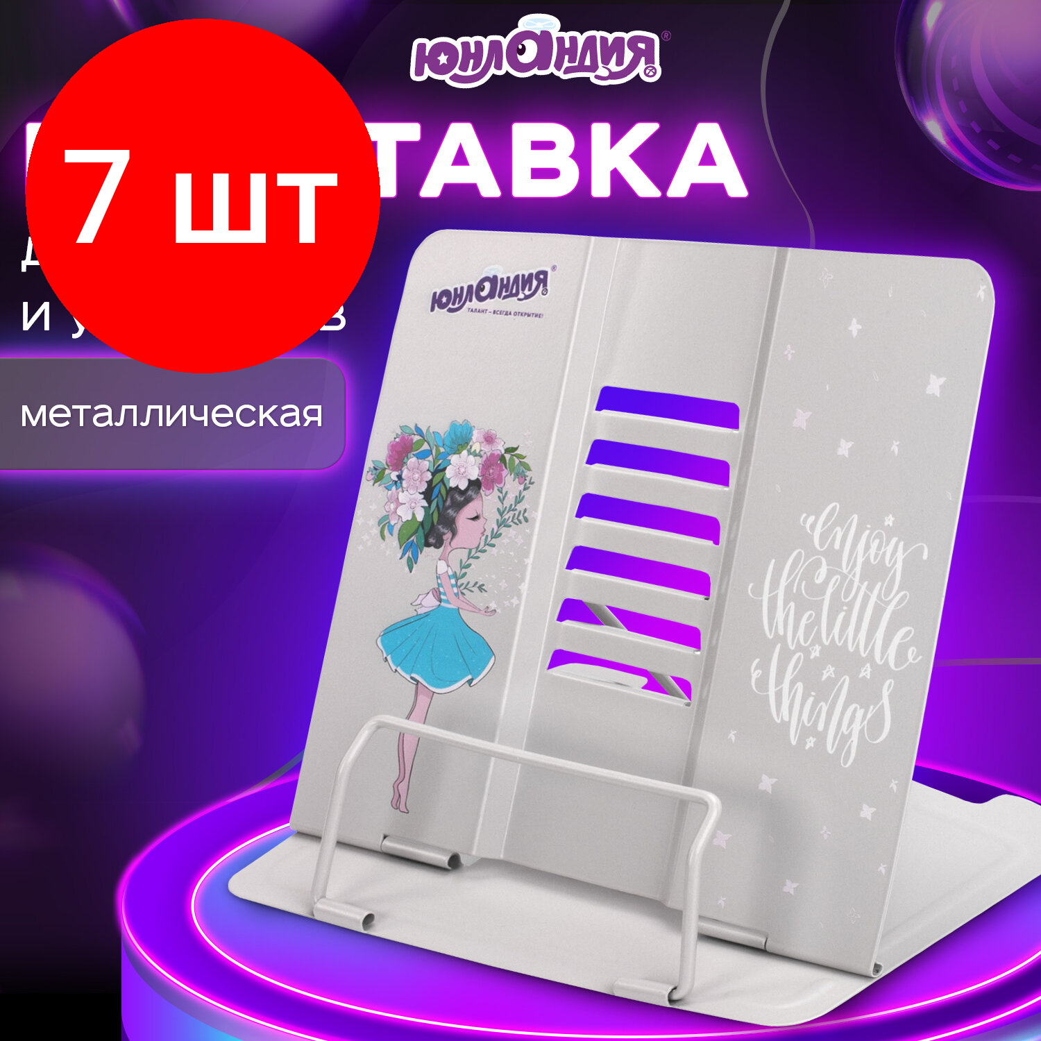 | Комплектация | [Подставка для книг и учебников ЮНЛАНДИЯ "Flower girl", регулируемый угол наклона, металл, 237578] X 7 шт. |