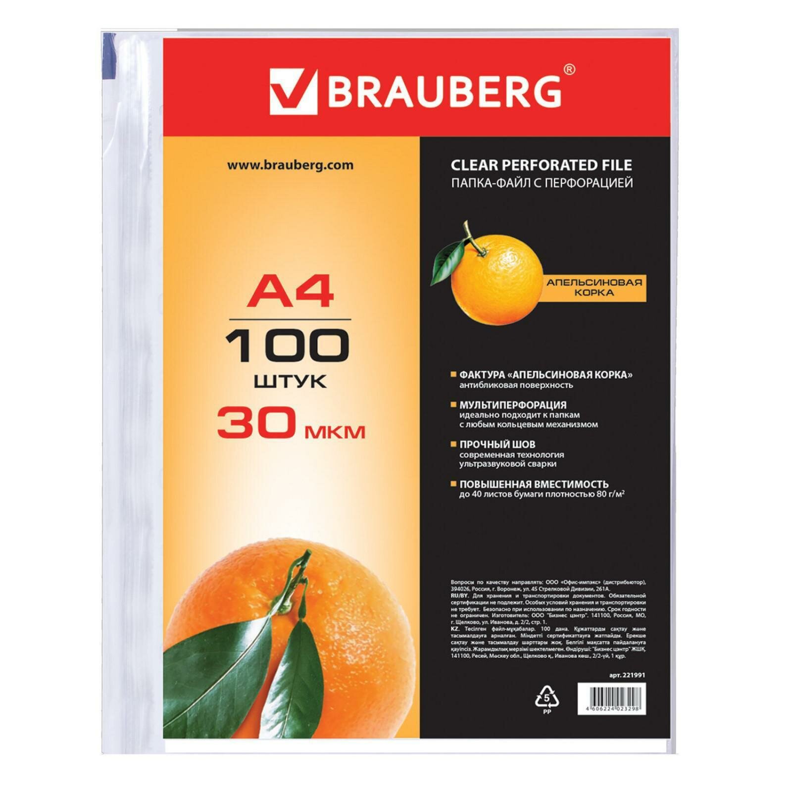 Папка-вкладыш (файл) с перфор. А4 (100шт/пач), апельсин.корка 30мкм матовые, Brauberg, 221991 интересное: