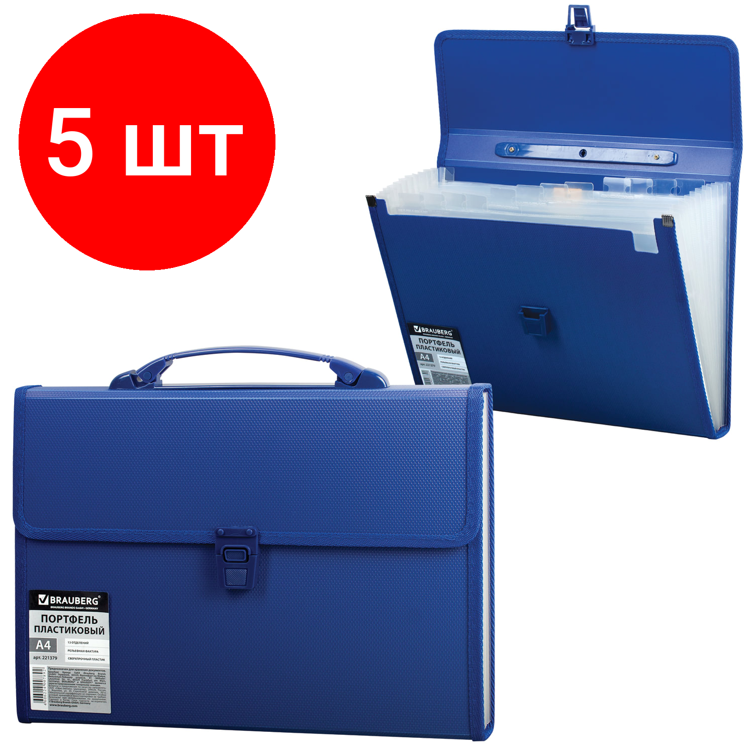 Купить Комплект 5 шт, Папка-портфель пластиковая BRAUBERG А4 (332х245х35 мм), 13 отделений, синяя, 221379