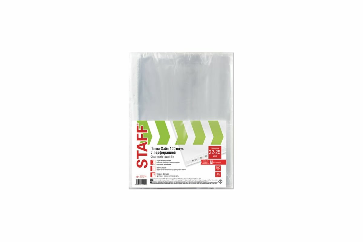 Папки-файлы перфорированные эконом, А4, STAFF, комплект 100 шт., гладкие, 22 - 25 мкм, 227374