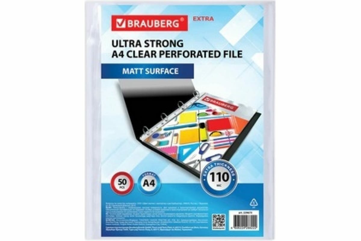 СохранитьПапка-файл / вкладыш / мультифора с перфорацией А4 Brauberg Extra 1100, Комплект 50 штук, матовые, 110 мкм, 229673 интересное: