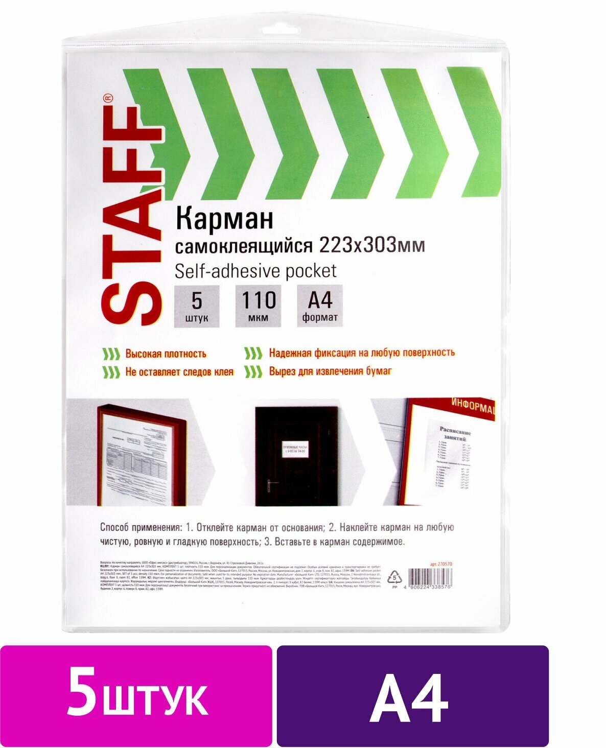 Карманы самоклеящиеся информационные на любую поверхность Формат А4 223х303мм, Комплект 5 шт, Staff интересное: