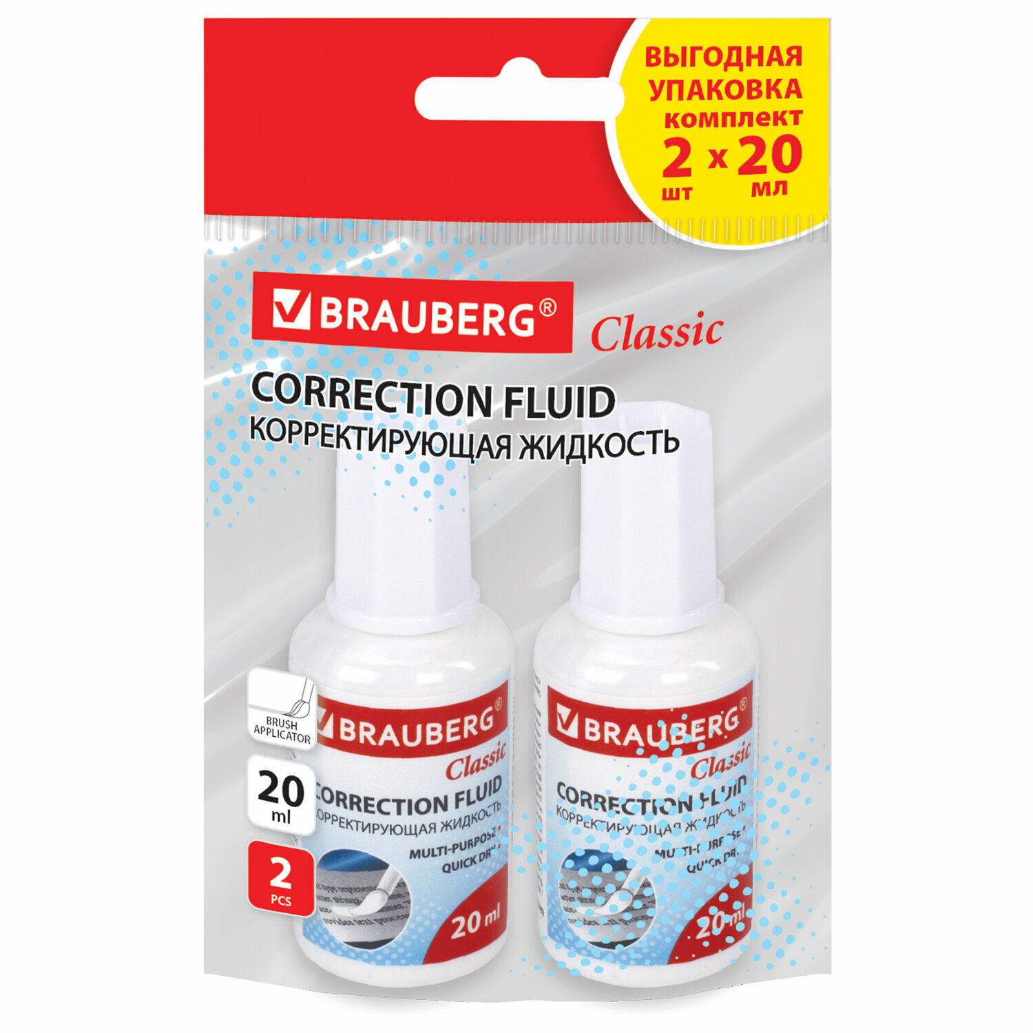 Корректирующая жидкость 20 мл выгодная упаковка, комплект 2 штуки в пакете, BRAUBERG CLASSIC, 271919