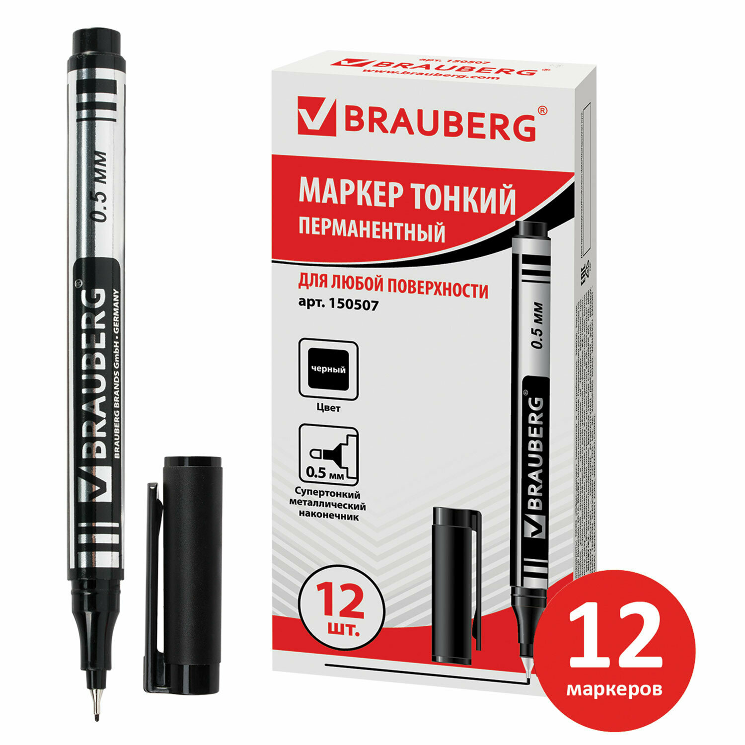 Купить Маркер перманентный черный тонкий 0,5мм комплект 12 штук, BRAUBERG, 880245