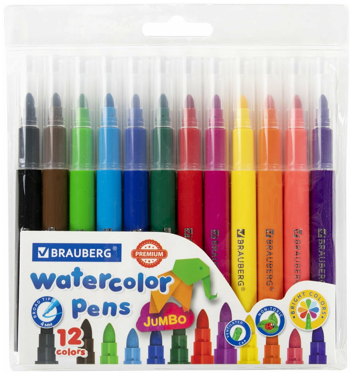 Набор фломастеров 12 цветов Brauberg Premium (линия 1мм, смываемые, утолщенные) ПВХ-упаковка, 12 уп.
