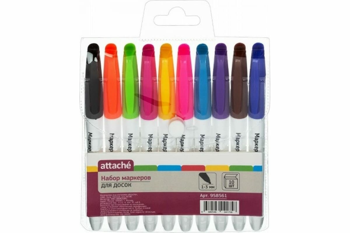 Купить Набор маркеров для белых досок Attache, 10 цветов, стираемые, толщина линии 1-3 мм, круглый наконечник